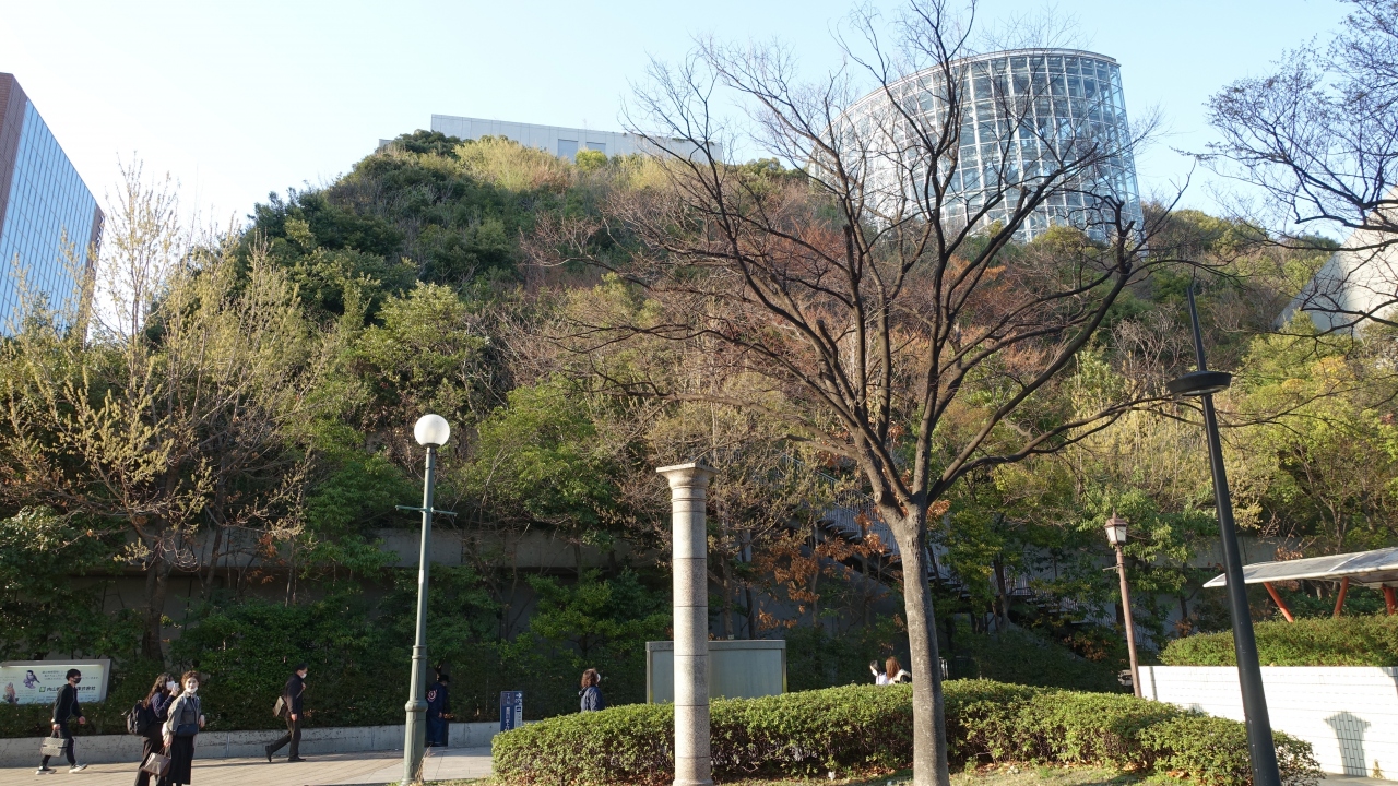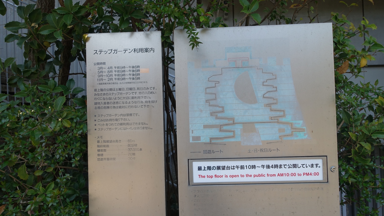 左右2か所に階段の登り口があり809段の階段を上っていくと、76種37000本の植栽が27年を過ぎて自然の山のようになっている。毎日午前9時から午後6時(冬季は5時)まで無料で登れるが、地上60mの屋上展望公園は土日祝日のみの開園になっている。