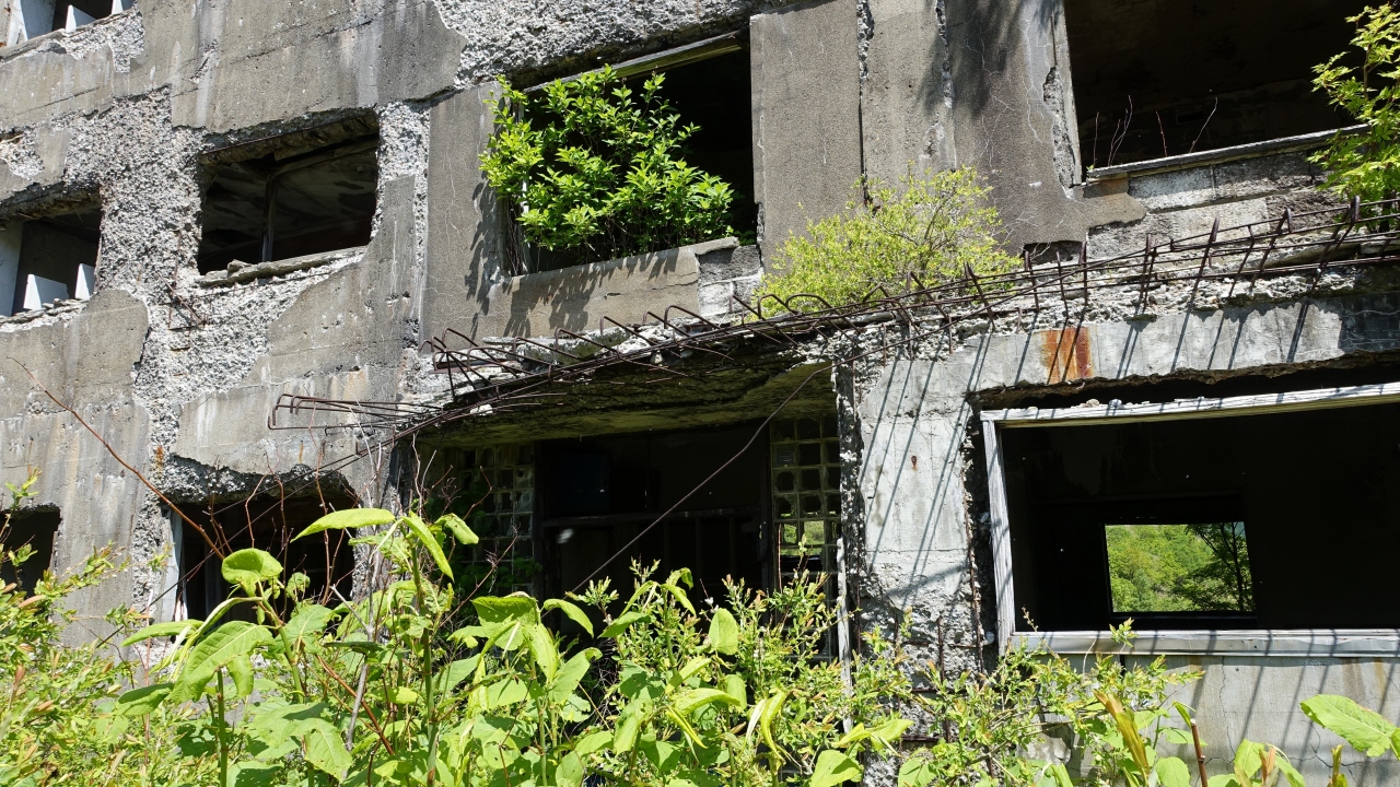 松尾鉱山はかって東洋一の規模を誇る硫黄や黄鉄鉱の鉱山で、最盛期には家族を含め15000人がこの場所で生活していたという。しかし閉山から50年余り、鉱毒排水の半永久処理という負の遺産を残したまま、アパート群は風雨に曝されたまま打ち捨てられ、周囲が荒野と化した中で黒々とした躯体を無残に晒している。割れた床から幹を延ばした樹木はやがて窓から大きく枝を出す、といった廃墟ぶりはある意味感動的である。