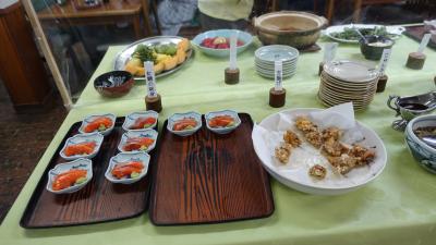 食事は朝夕ともビュッフェ形式で郷土料理から地元の山菜を使った料理などでヘルシー志向。決して豪華ではないが品数が多く、食後に頂く名水源太清水で淹れたコーヒーはとても美味しかった。