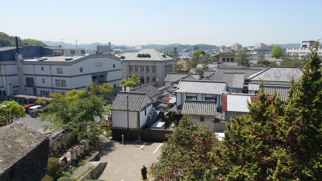 海鼠壁の町家や洋風の木造建築が並ぶ本町通りを歩くと、鶴形山隧道(トンネル)と並行した石段があり、ここを上ると観龍寺の山門がある。山門から振り返ると倉敷美観地区の家並を一望でき、多くの人がここで写真を撮っている。