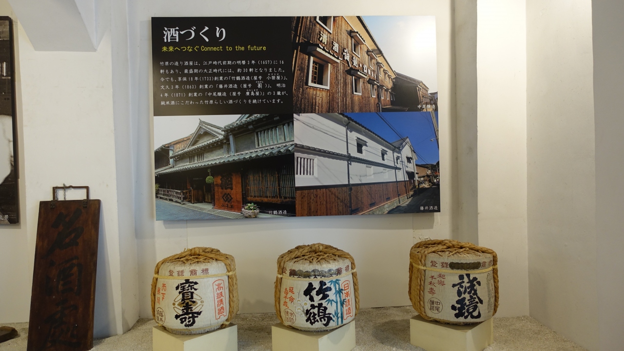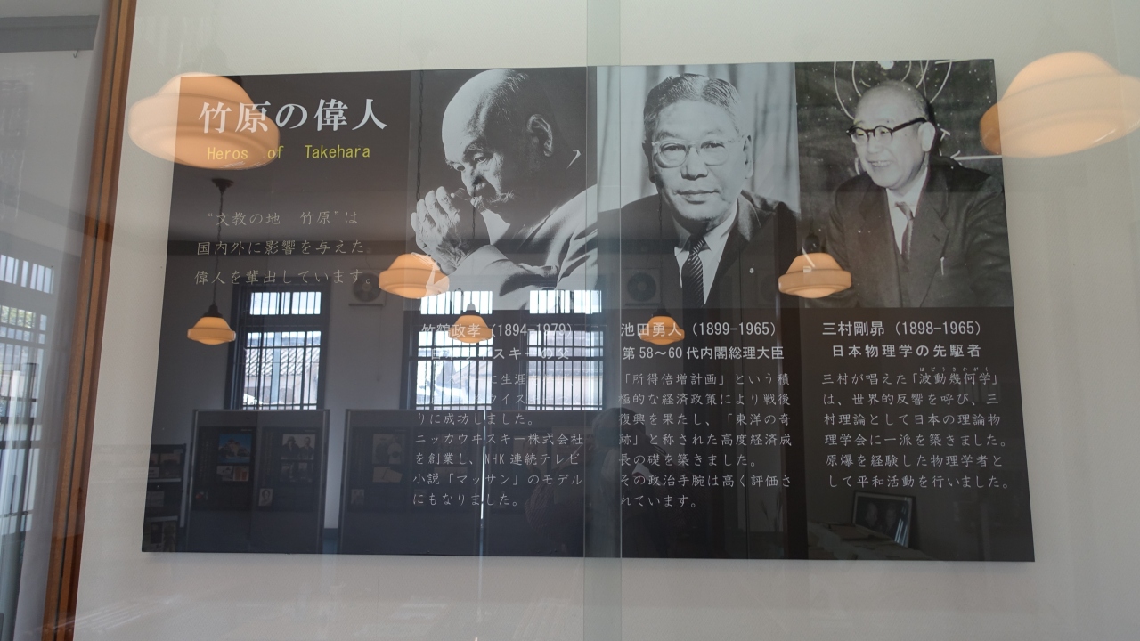 本町通を北に歩くと右手に白とスカイブルーの木造洋風建物がある。江戸時代の「竹原書院」の跡に昭和初期に建てられた図書館で、現在は歴史民俗資料館になっている。内部には竹原の伝統産業である製塩業や酒造業に関する資料が展示されている。また竹原は「日本ウィスキーの父」竹鶴政孝や高度成長の先駆けになった池田勇人首相など、多くの人材を輩出しており彼らの功績を示す資料も展示されている。建物の横にはNHKの朝ドラで有名になったマッサンとリタ(ドラマではエリー)の像が建っている。