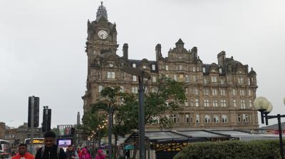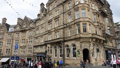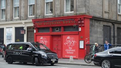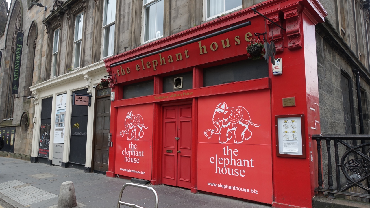 ロイヤルマイルから南に折れてジョージ4世橋の方向へ歩くと、古いビルの一階に入口が赤く塗られ像の絵が描かれたカフェがある。作家 J・K・ローリング がハリーポッターの初期の作品を執筆した場所で、お店も売れない作家に気持ちよく居場所を提供したという。しかし2年前に火災に遭ったそうで、訪れた時は営業を休止していた。