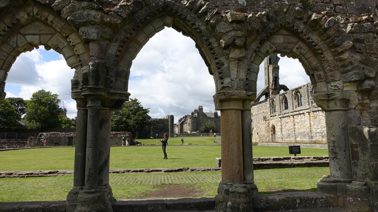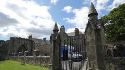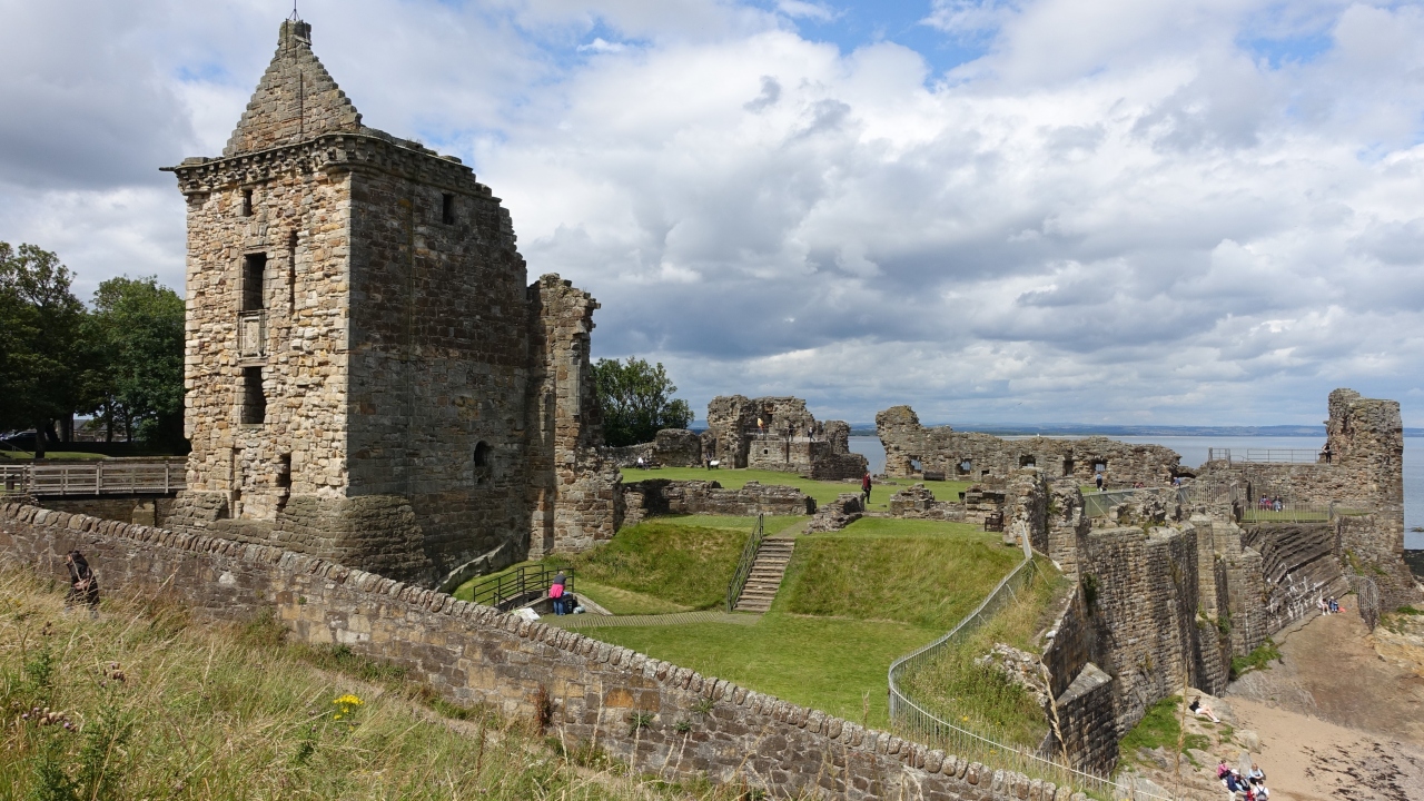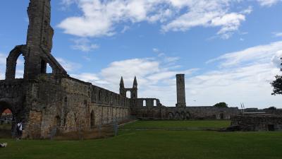 セントアンドリュースの中心から海岸の方向に歩いて行くと、廃墟になった聖アンドリュー大聖堂がある。14世紀初めに建立されスコットランド最大かつ最も壮麗な中世の教会群だったが、宗教改革で破壊されそのまま廃墟として残っている。緑の芝生に覆われた広い敷地内には修道院の壁や尖塔の一部が残り、当時の繁栄を偲ぶことが出来る。敷地内は無料で自由に歩ける。