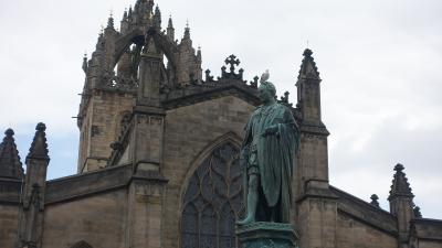 ロイヤルマイルの中心に堂々と建つ大聖堂。王冠のような屋根が特徴で最初はカトリック教会だったが、宗教改革以降はプロテスタント教会となった。大聖堂広場の正面には宗教改革の指導者ジョン・ノックスの像、裏面には国富論のアダム・スミスの像が建つ。