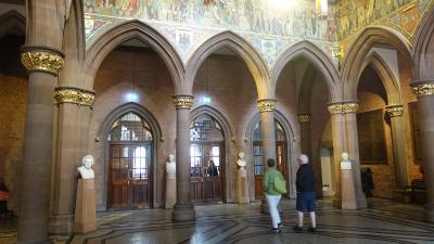 ここは約3,000点の絵画や彫刻、25,000点の版画や線画、38,000点の写真を所蔵しているが、見どころはエントランスを囲むモザイク画。アーチと柱で構成された壁面には黄金色モザイク画で描かれており、あたかもイタリアのラヴェンナにある初期キリスト教会のモザイク画を見るよう。ただ、描かれているのは神でなく一般市民。1階から2階と見る場所を変えると印象も変わる。