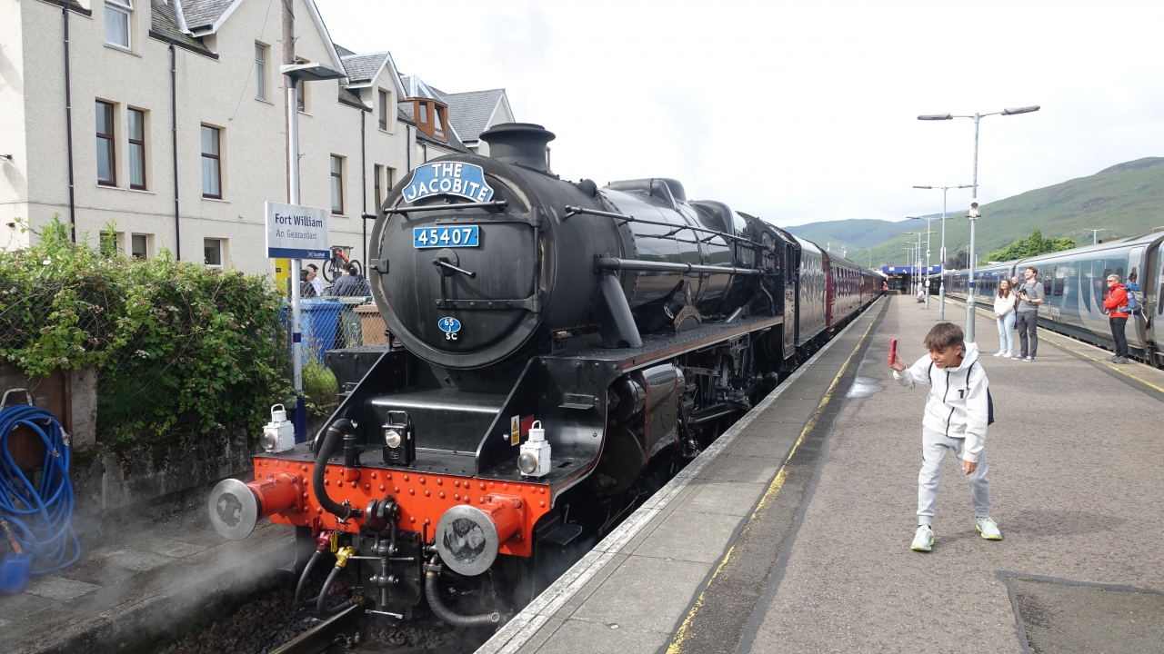 ジャコバイト号はフォートウィリアム駅から西ハイランド線の終点マレイグ駅間を走る観光SL。映画ハリーポッターでジャコバイト号がグレンフィナン高架橋を通過する場面ですっかり有名になった。グレンフィナン高架橋以外にも沿線はハイランドの絶景が続き、予約が非常に困難な列車である。仮に予約が出来なくてもフォートウィリアム駅からの出発を見送ることが出来る。列車の出発は10時15分と12時45分(土曜日は14時40分)の一日2回。午前中の便はロンドンから来るカレドニアン・スリーパーに連絡している。