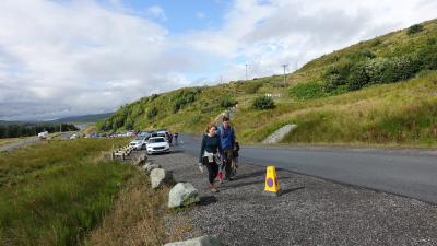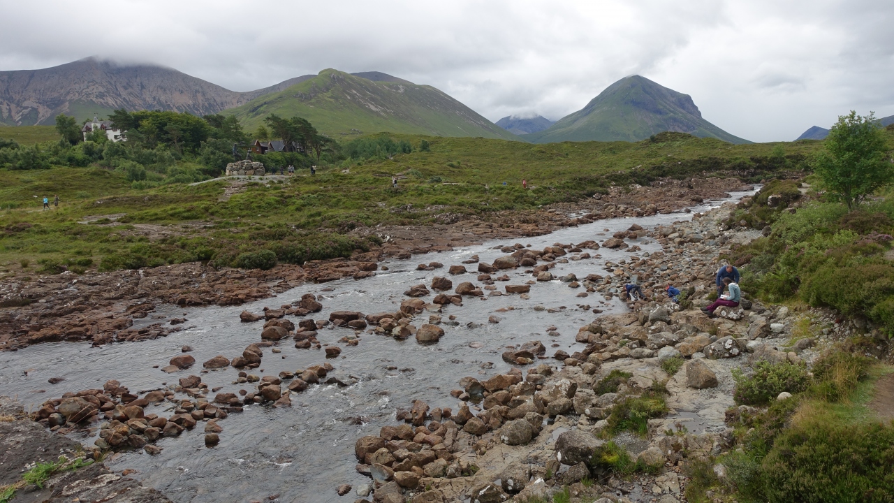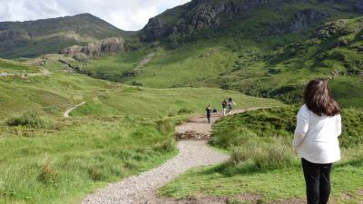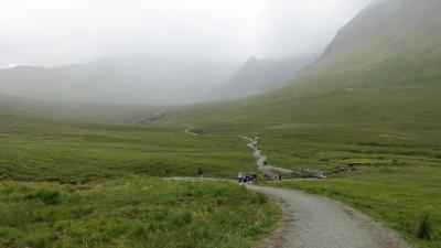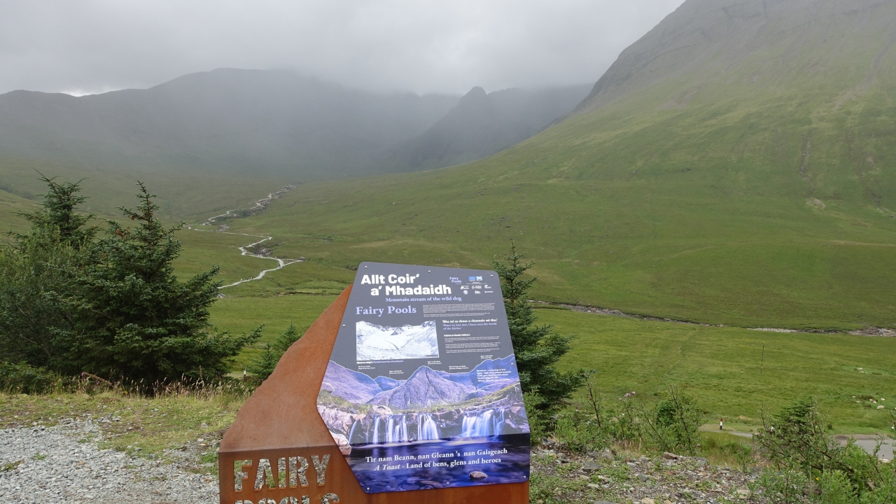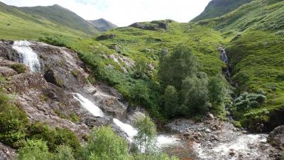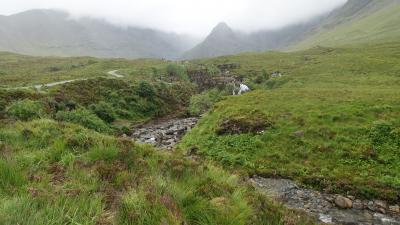 駐車場から見るとクイリンヒルズから流れ出した渓流が蛇行するのが見える。一旦坂道を渓流まで下り、そこから緩やかな坂道を渓流に沿って上っていく。道はそれほど悪くないがスニーカー以上の足拵えは必要。訪れた時は霧雨で連続する滝や淵と背後のクイリンヒルズの山々は、「これぞハイランド!」といった幻想的な風景だった。多くの人が歩いていれば問題ないが、天気が変わりやすく霧がかかれば場所が分からなくなるので、くれぐれも渓流から外れないように。- 旅行時期