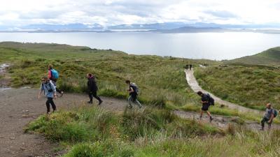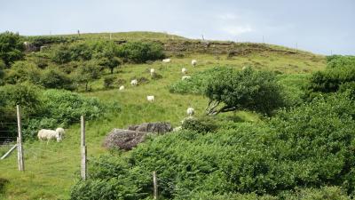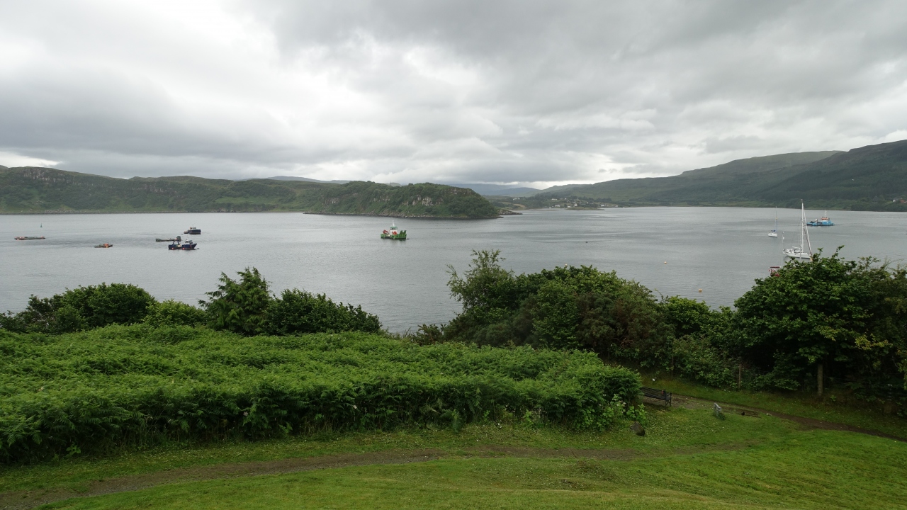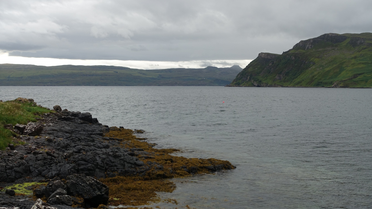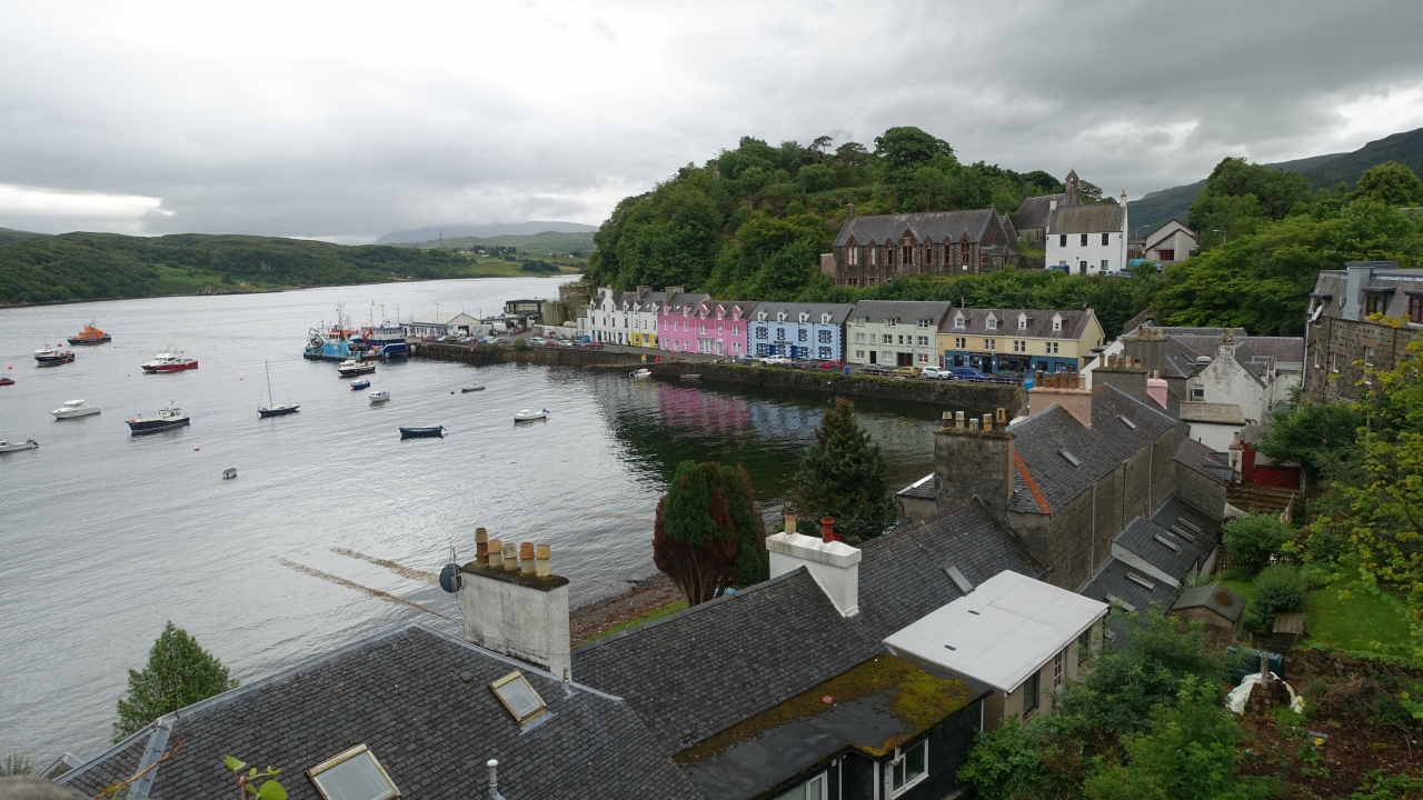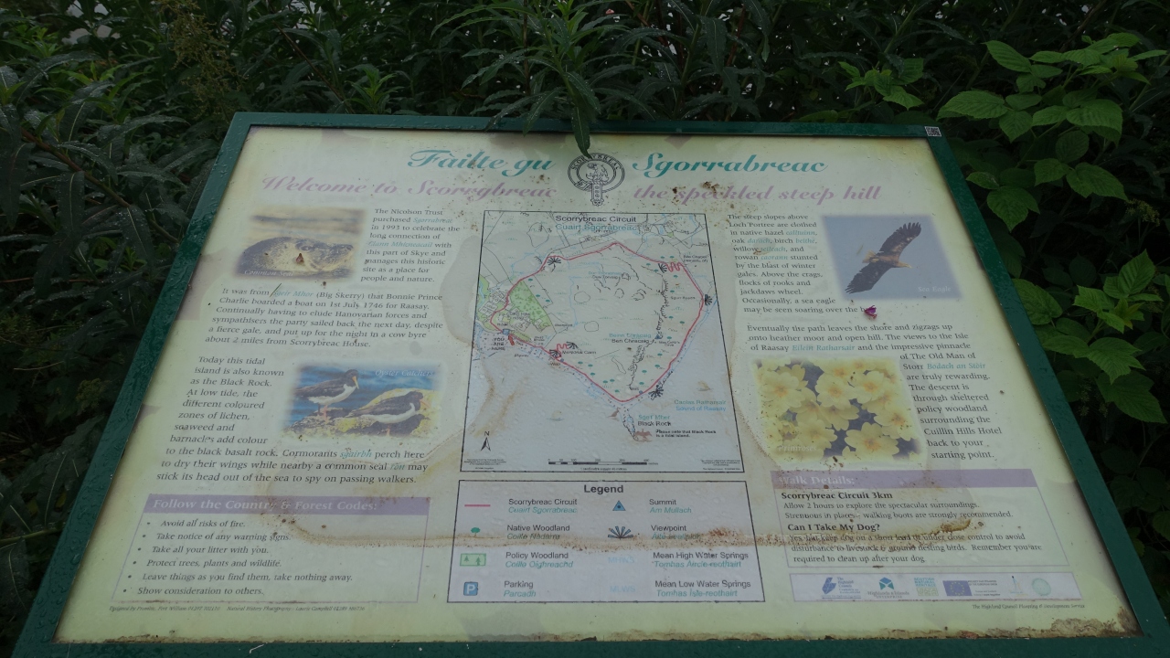 ポートリーでお手軽に歩くことが出来るトレイル。ポートリーから海を見下ろす高台の住宅地に沿った道を上がっていくと、港のカラフルな建物を遠望するビューポイントがある。高台から一旦海岸に出て、その先にフットパスのゲートがある。ゲートから緩やかな坂を行くと岬の展望台に出てボートの浮かぶポートリー湾を一望できる。その先は陸地が台形型になって海に沈むスカイ島らしい荒々しい光景が続く。