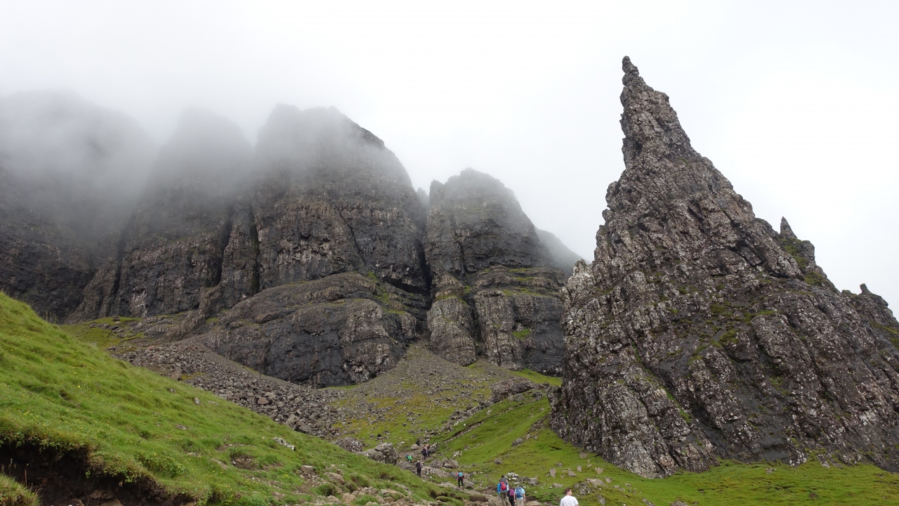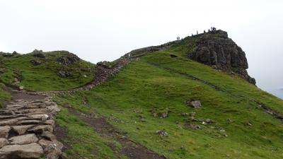 ここで引き返す人も多いが、折角ならあと30分頑張ってStorr Lookout Pointまで歩こう。実はこの先が真の絶景。但し勾配はやや急になる。オールド マン オブ ストーの直下を過ぎるとNeedle Rock。溶岩が風化して先端が針のように尖った巨岩。Needle Rockを過ぎるとStorr Lookout Pointの断崖が見える。断崖の上は平らな台地になっていて、ここから見るオールド マン オブ ストー、Needle Rock、もう一つのギザギザの岩石が並ぶ風景はスカイ島の写真の代表的なシーン。