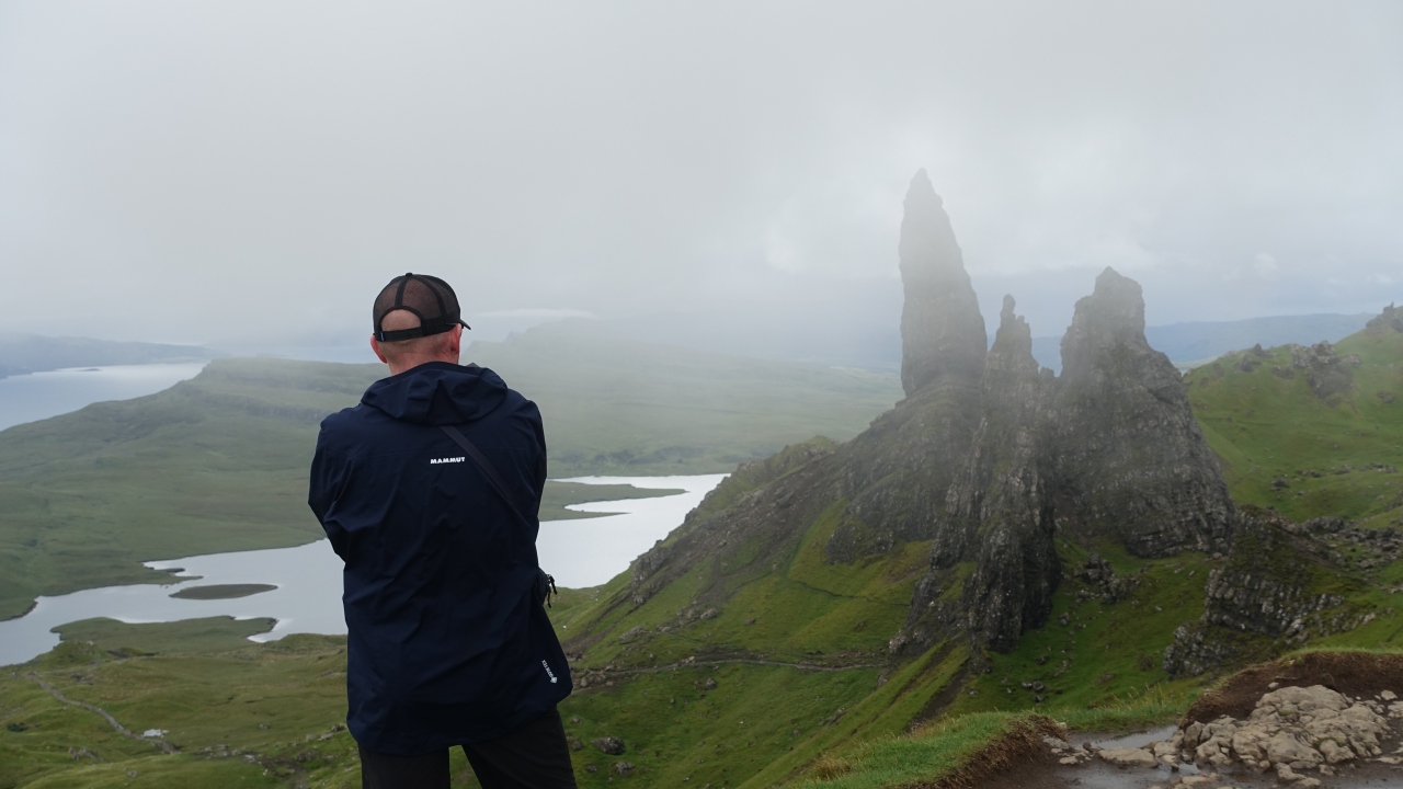 オールド マン オブ ストーはキルトロックと並んでスカイ島の2大絶景。高さ55メートルの玄武岩の巨岩で、28億年前の火山栓の残骸が地滑りで現在の場所に立っている。起点はポートリーからバスで15分のOld Man of Storr Car Park。バスは1日7便で日曜日は運休になるので注意。