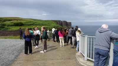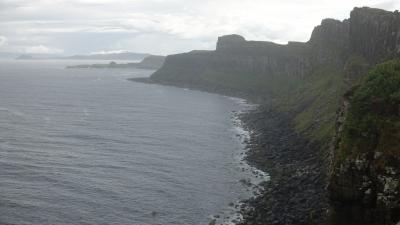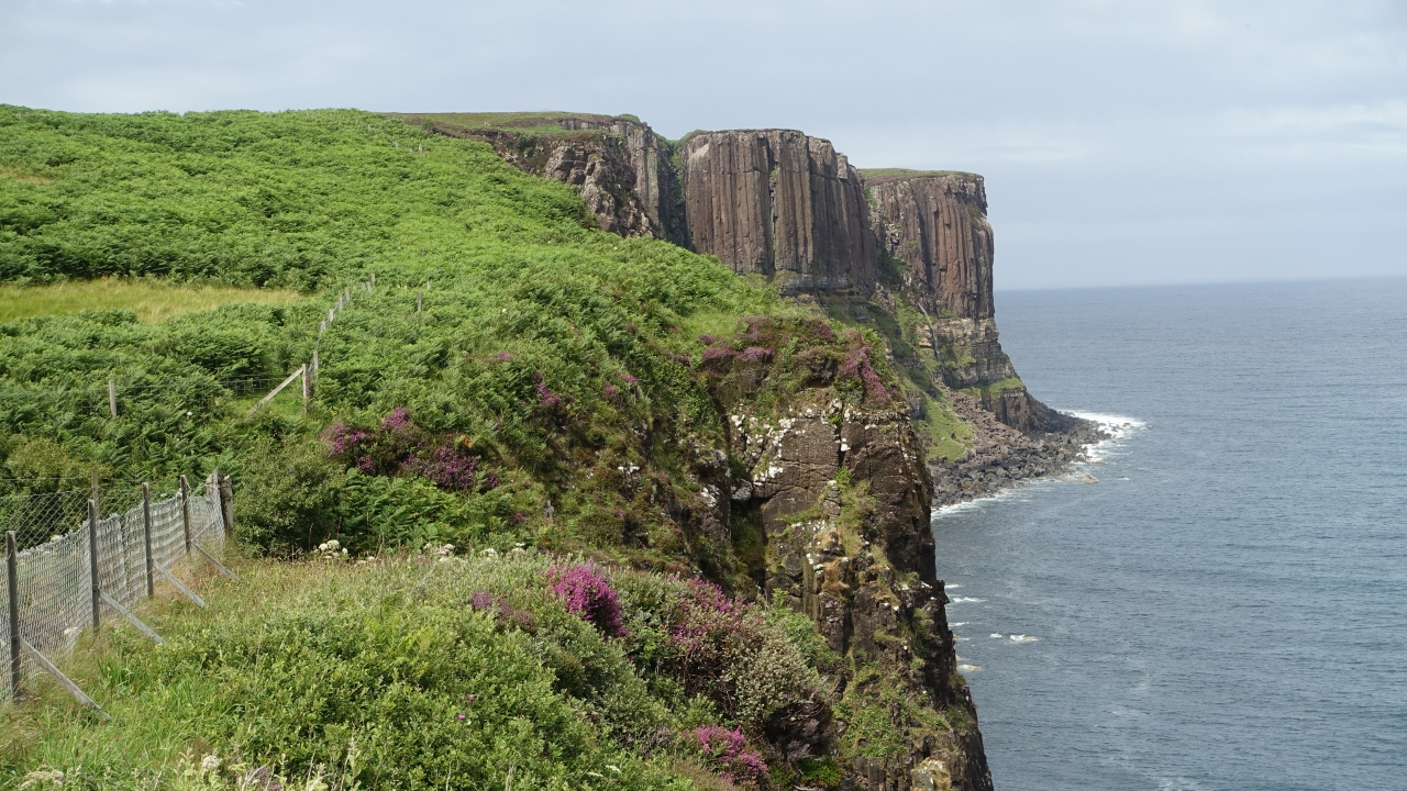 広い駐車場の先が展望台になっいている。メオルトの滝は展望台の真横にあるので、断崖と滝を撮るには展望台から思い切り腕を伸ばさなければならない。カメラやスマホを落とさないように十分な注意が必要。キルトロックは垂直に立つ60mの断崖で、柱状節理が民族衣装キルトスカートのひだに似てることからこう呼ばれている。このような断崖がトロッターニッシュ半島の北東部海岸で、数kmに渡って続いている。オメルト滝は垂直の断崖をそのまま海に流れ落ちる。水源は直ぐ近くのメル湖で水量で迫力十分。