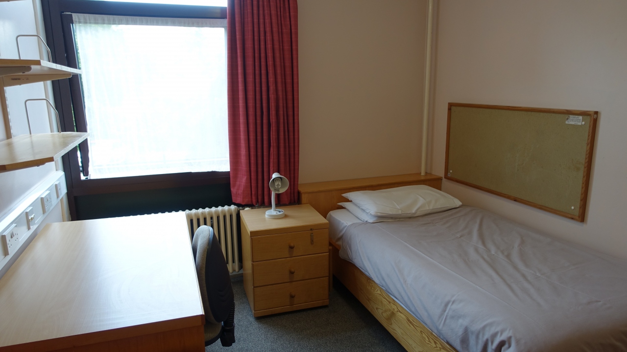 広い敷地には宿泊棟や各種厚生棟が並ぶ。レストランの他にコンビニ等もあり寮内で生活は完結できる。部屋は広めで清潔。大きな机、シングルベッド。洗面台、クローゼットが備えられている。トイレとバスは兼用だが数が多いので混雑することはない。バスタブ付きのシャワールームもある。食事は広い食堂でのカフェテリア形式。メニューも豊富で朝食は宿泊料に入っている。夕食は別料金で£20で主菜の肉魚料理はボリューム満点でデザート類も充実。