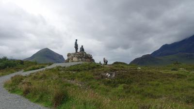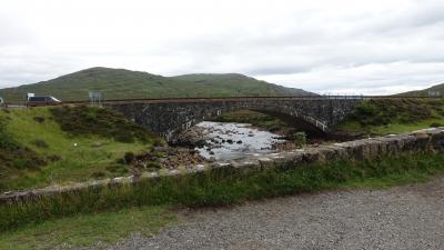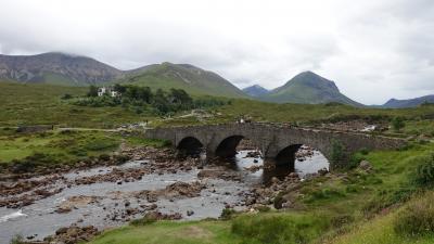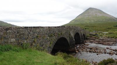 スリガチャン オールド ブリッジ は写真で時々見るスカイ島のビューポイントの一つ。クイリンヒルズの山々を背景に、そこから流れ出す清冽なスリガチャン川に架かる3つのアーチを持つ石橋はため息が出る程美しい。石橋は200年前に架けられ現在は歩行者専用。国道に架かる新しい橋と並行している。場所はスリガチャンのバス停からすぐ。グラスゴーとスカイ島を結ぶ路線やフェリー乗り場のある南部のアーマディールからのバスが停車するが便数は多くない。