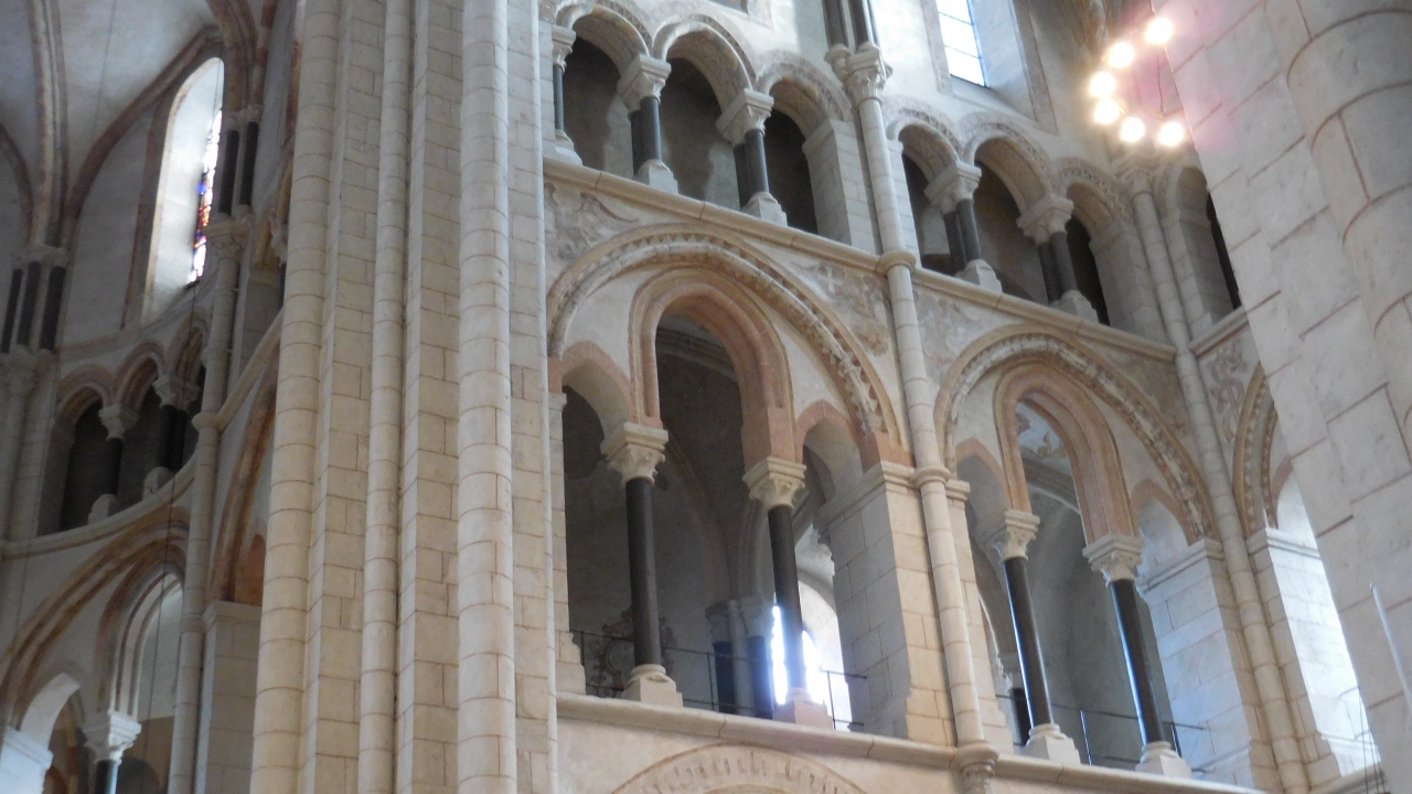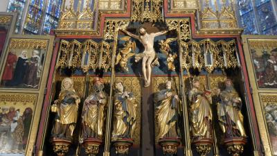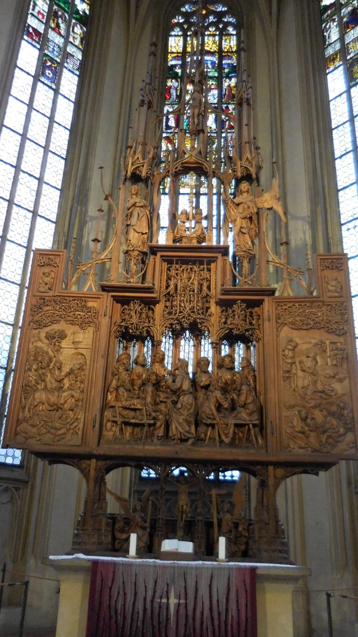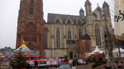 大聖堂は旧市街の北東の丘の上にある。正面から見るとバラ窓が左右対称の2本の塔で挟まれた独特の形で、中部ドイツ特有の白壁に赤茶色のレンガ鮮やかである。内部はグレーの石造りで何層も重なったアーチは重厚である。