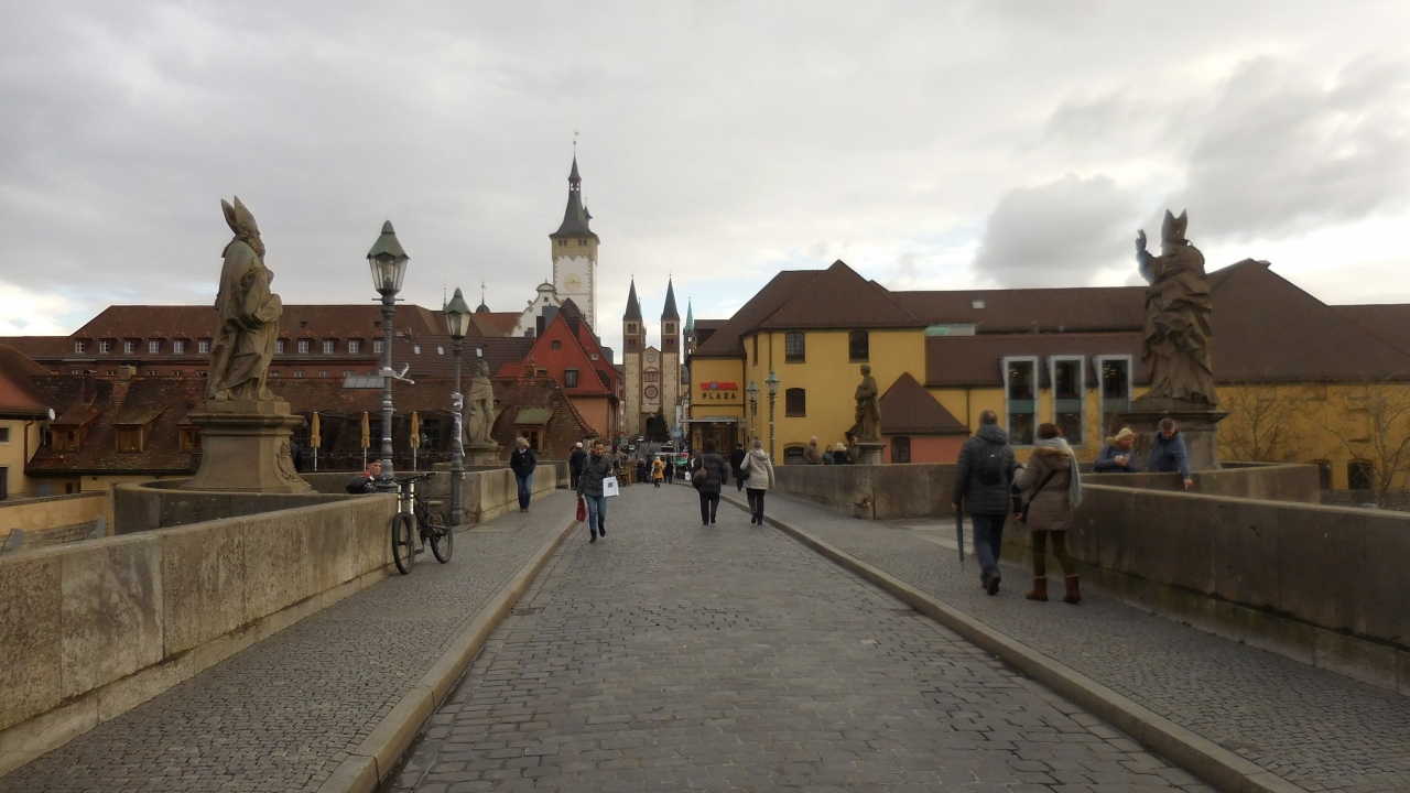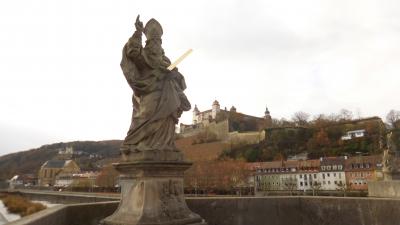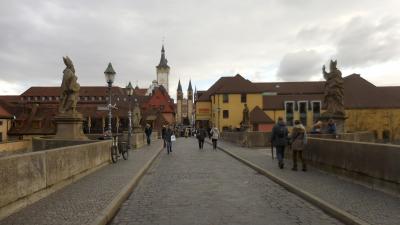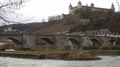 ここから見たマイン川にかかるアルテ・マイン橋と背後の丘の上にマリエンベルク要塞は、プラハのカレル橋とプラハ城を見るようでクレーンと合わせて写真に収めることが出来るポイントである。- 旅行時期