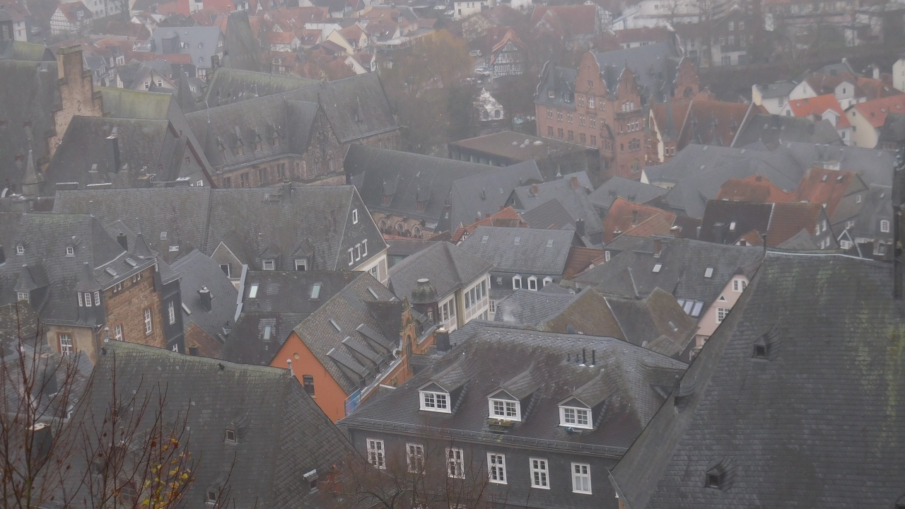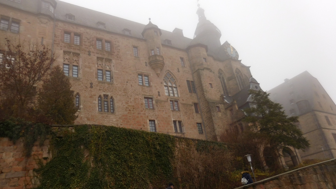 マルクト広場から北西にマリエン教会の横の急な坂を上って行くと、石垣の上に覆いかぶさるような力強い城が見えてくる。城は濃いグレーの屋根に茶色の石で造られ、重厚で落ち着いた雰囲気である。内部は博物館になっているが、建物の外観を見るだけで十分満足できる。城の石垣から眺める旧市街はグレーや赤い屋根を持つ家並が、まるでおもちゃ箱のように見える。