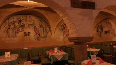 入り口付近の壁には壁には鹿の角や狩猟道具の数々が飾られ、奥の部屋の壁には一面には大工仕事を描いた絵が描かれているなど、雰囲気は満点。料理は伝統的なドイツ料理で、ジビエの季節には鹿肉のステーキを食べることが出来る。- 旅行時期