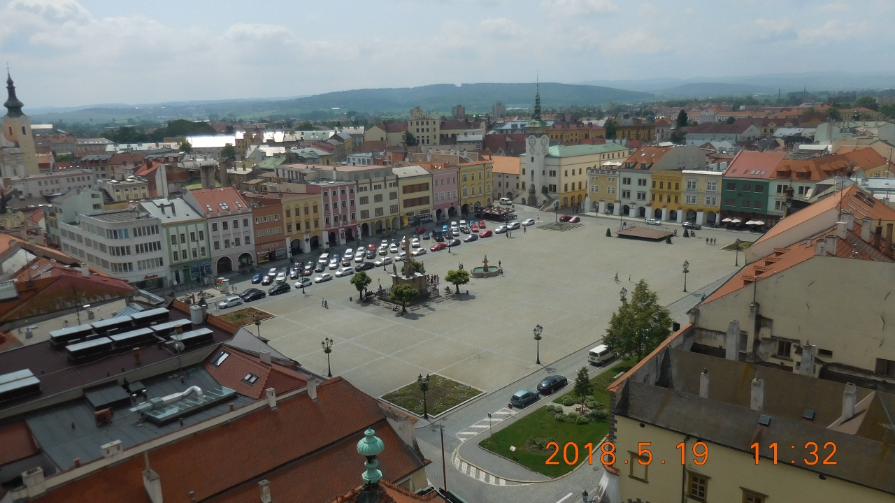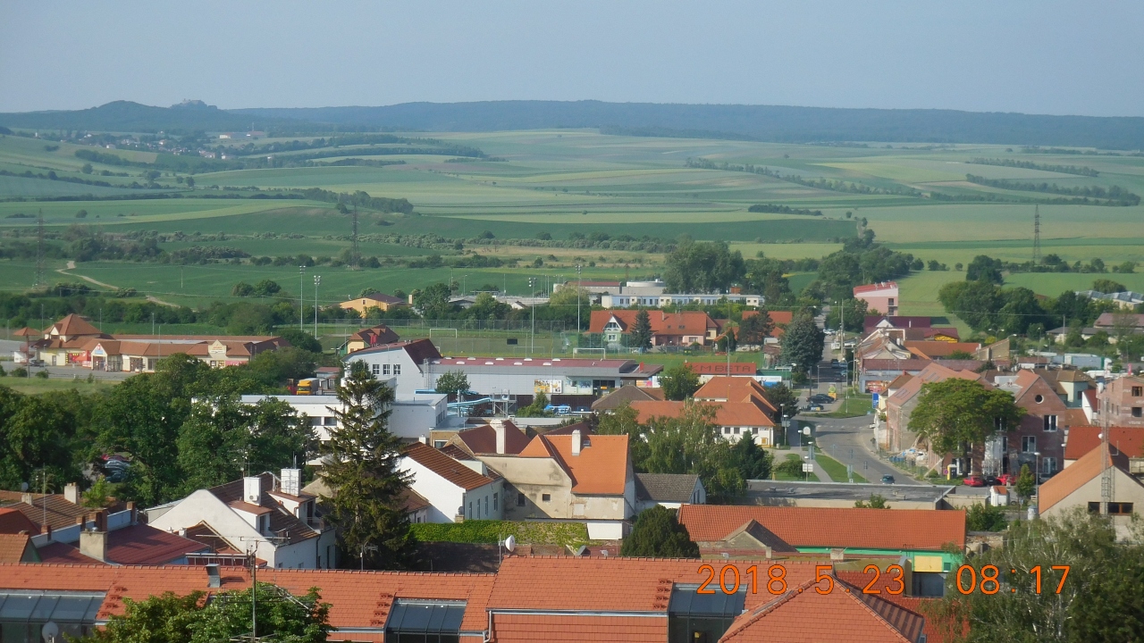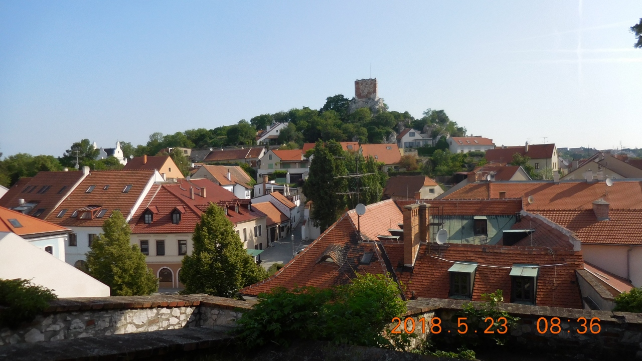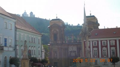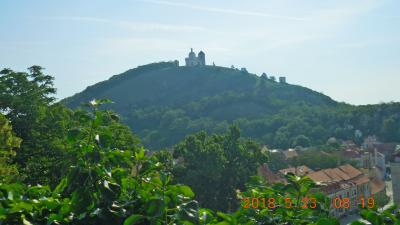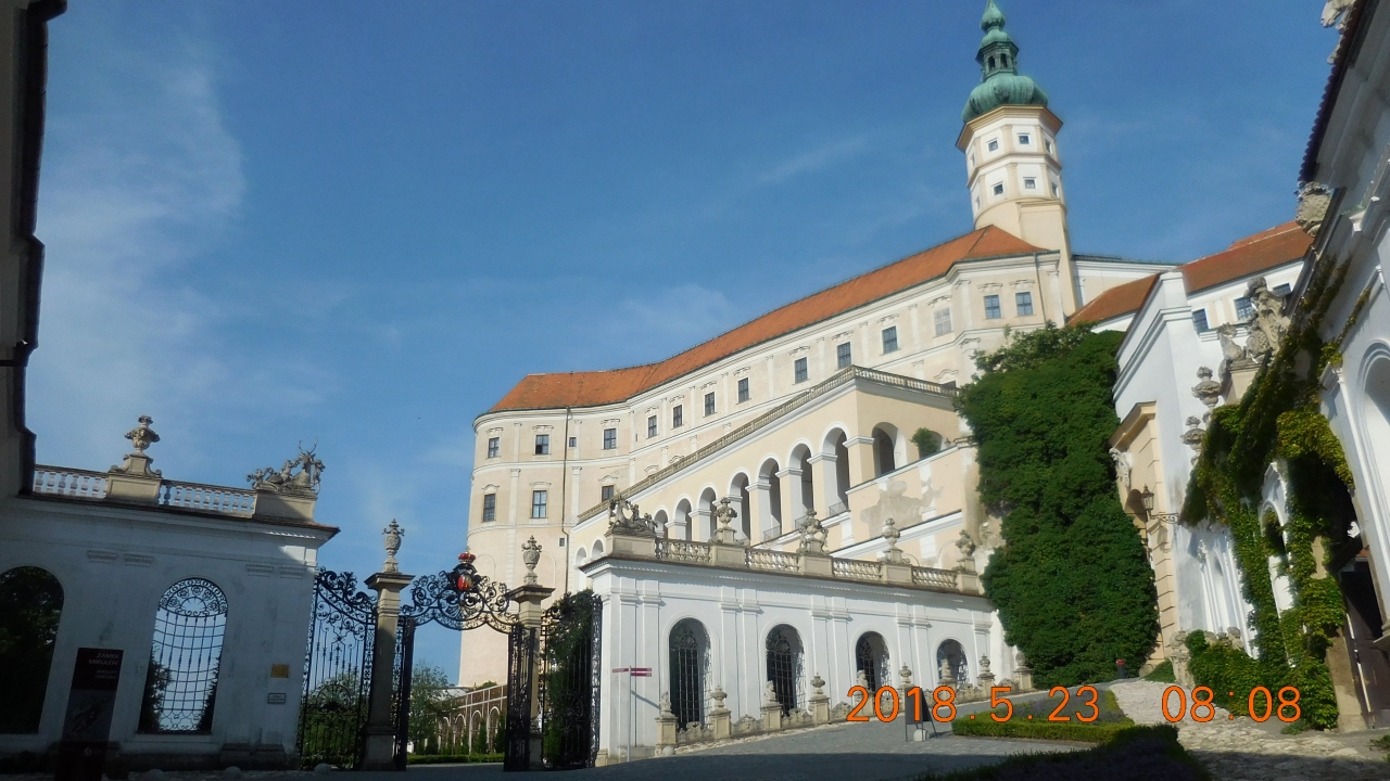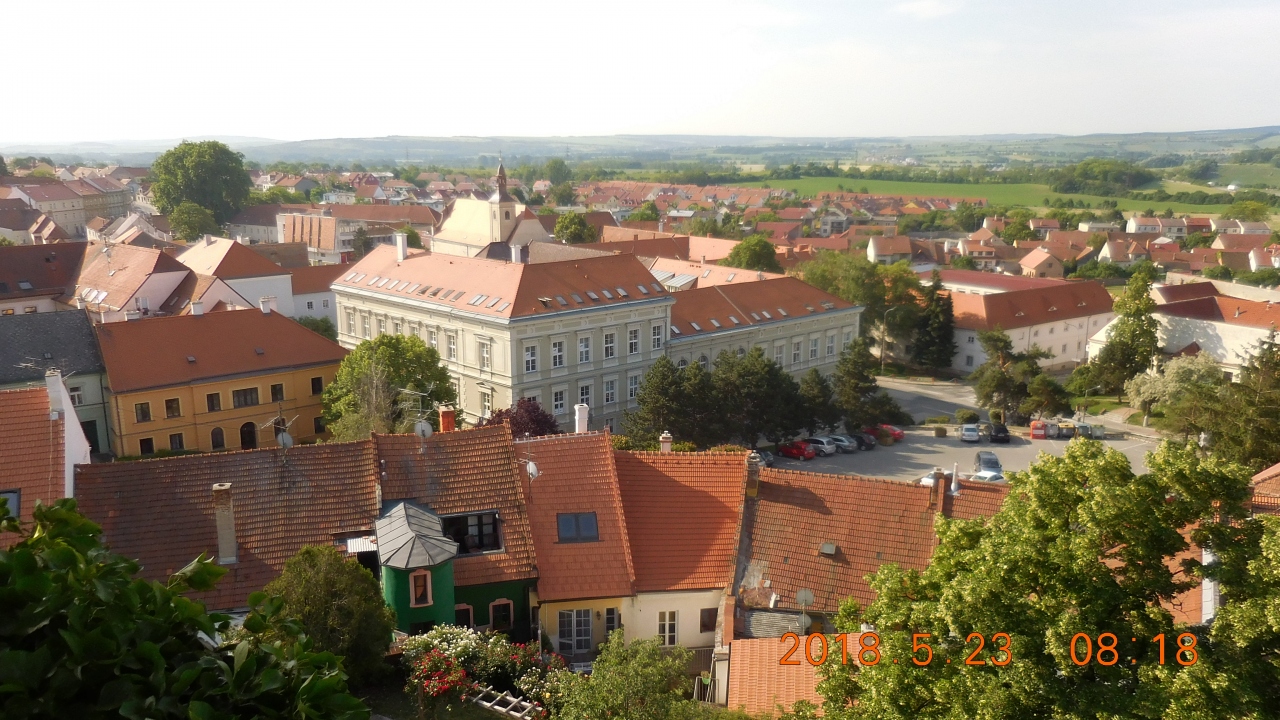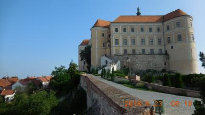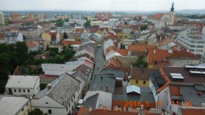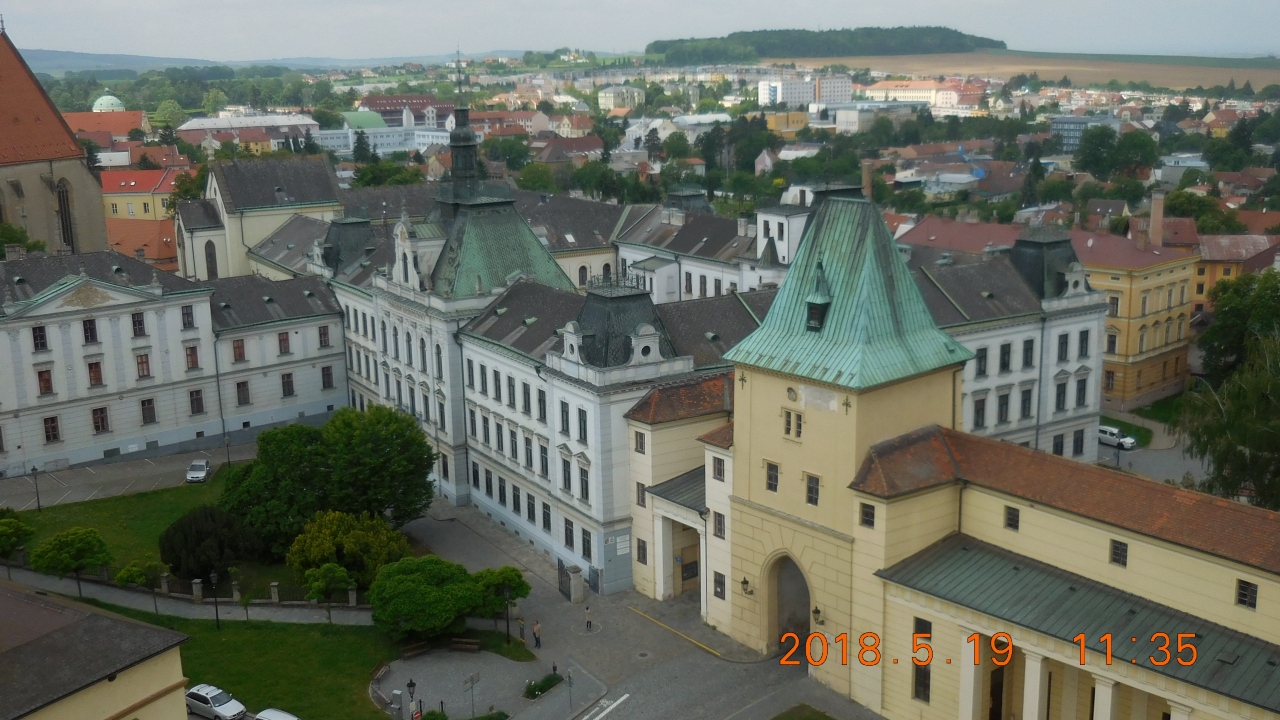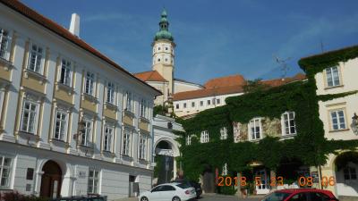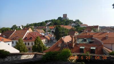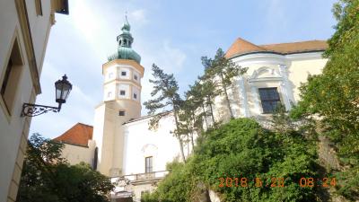 上の城に行く途中の上り坂からの眺めは絶景です。足元に赤い屋根が連なるミクロフの旧市街が、その向こうに聖なる丘や山羊タワーが見え、更にその先にはブドウ畑とモラヴィアの大草原が広がっています。