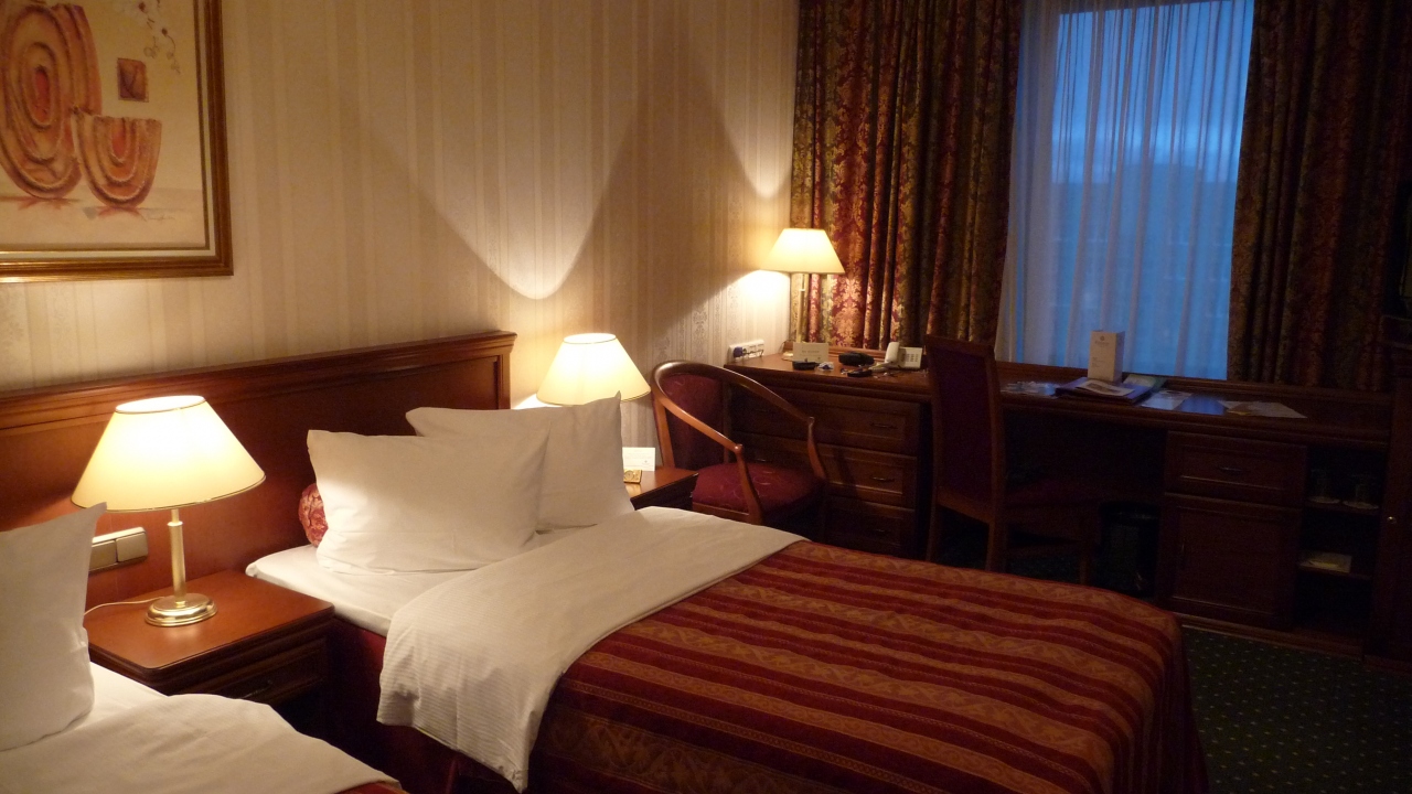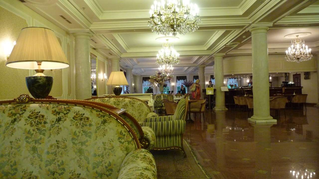 モスクワ中心部から南西に少し離れた場所に位置する大型ホテル。近くに地下鉄の駅があるが、周囲は静かで商店等は見当たらなかった。内部はヨーロッパ調でシックなまとめられて居心地がいい。モスクワ川に近いので朝晩に河畔を散歩できる。雀が丘は徒歩圏内。