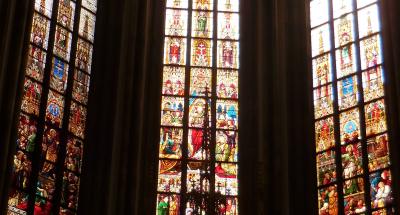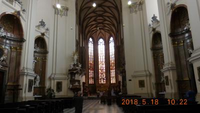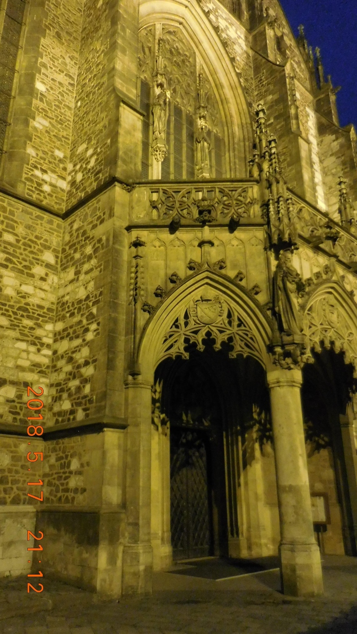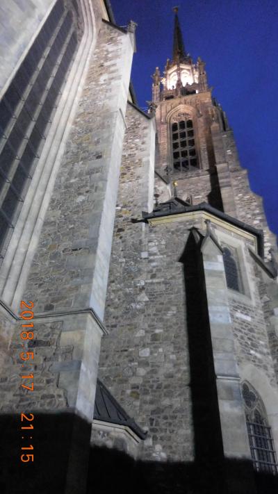 高い尖塔をもつ濃茶色のレンガ造りの重厚な教会です。内部は天井の高いゴシック様式でステンドグラスが美しい。夜はライトアップされた教会が黄金色に輝き、周囲の路地も静かで雰囲気があります。治安も問題ないので夜の散策をお勧めします。