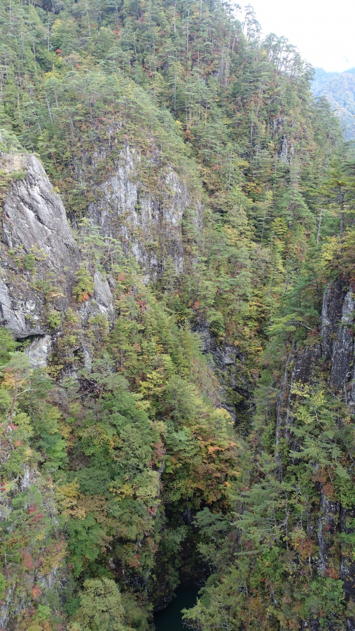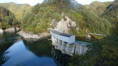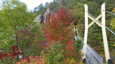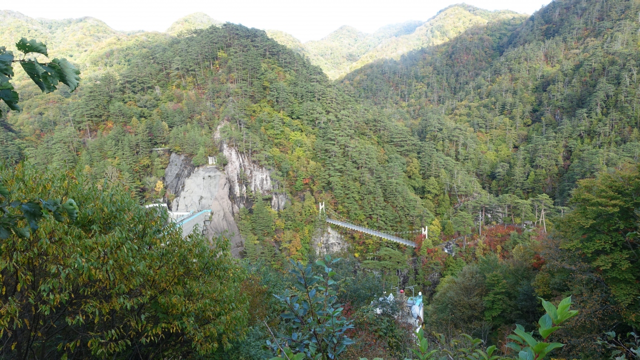 瀬戸合峡に行くには県道23号線から分岐した細い道を川俣ダム駐車場まで行く。駐車場の先に遊歩道入口のゲートがあり、そこを進むと川俣ダムに着く。川俣ダムはコンクリートアーチ式ダムで堤長131m、堤高117m。正面の展望台から見るとなかなかの迫力。ダム湖の下流が瀬戸合峡で、「渡らっしゃい吊り橋」まで遊歩道が続いている。吊り橋は近くに見えるが途中には100段以上の階段を上り下りす必要がある。しかし吊り橋近くから見る瀬戸合峡は本当に素晴らしく苦労の甲斐は十分。