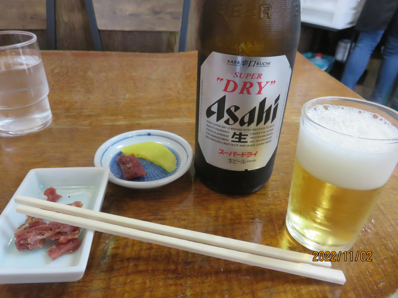ビールの突き出しに、こちらのお店で作っている美とんハマジャーキーが提供されました。