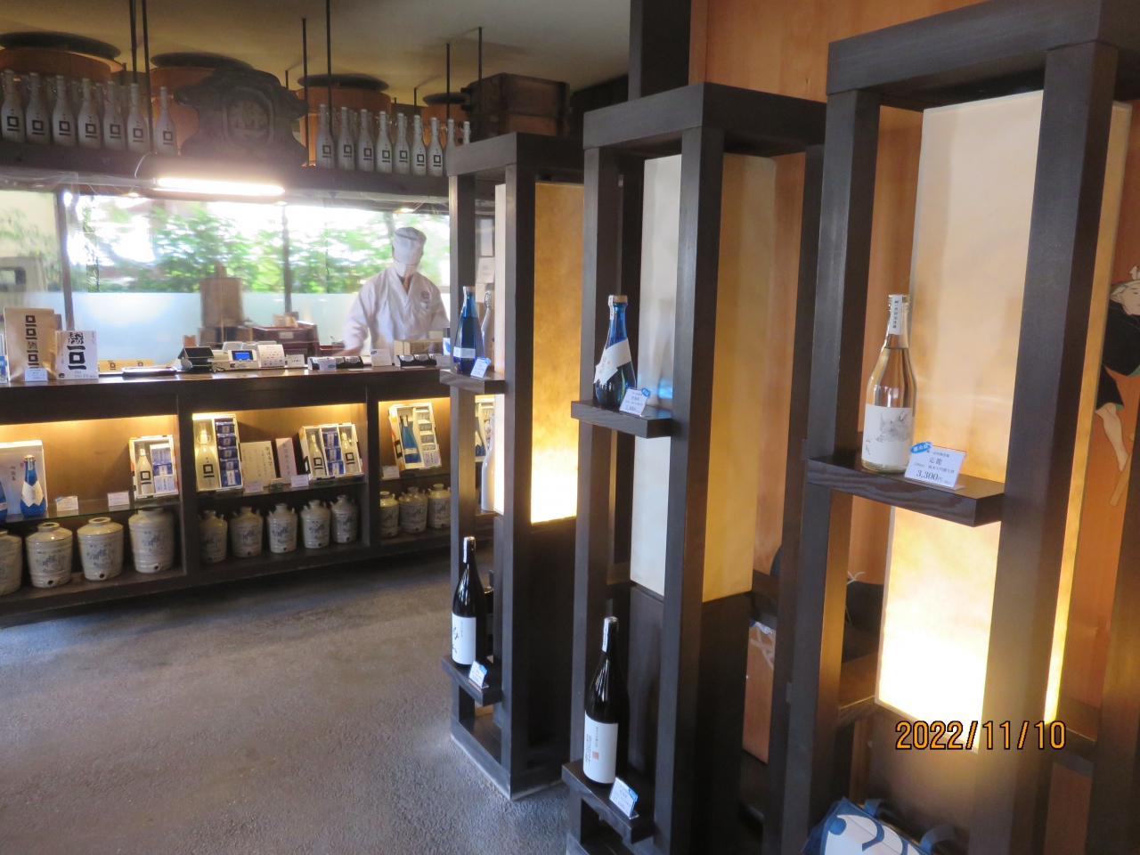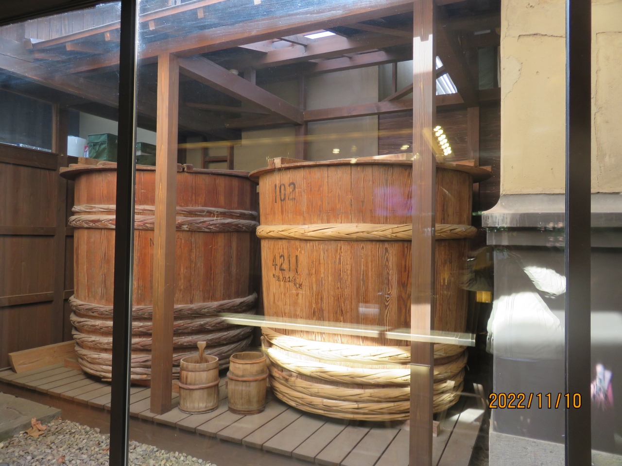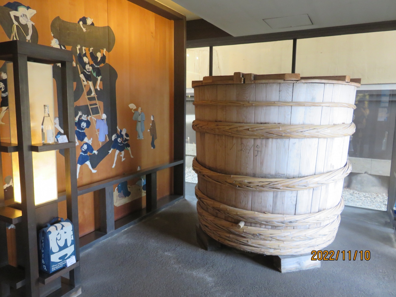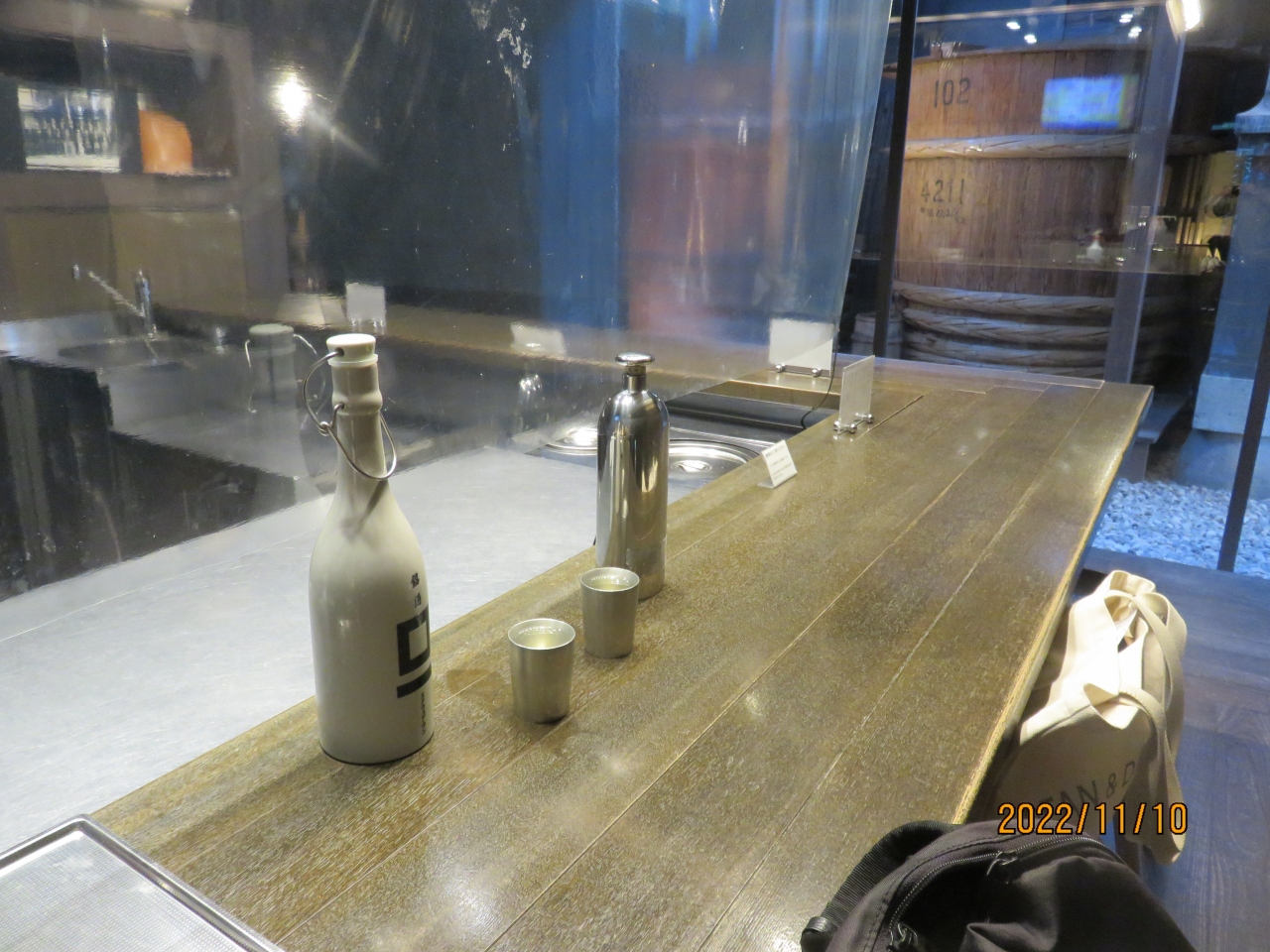 店舗内には、テッパ(手盃)台と呼ばれるカウンターがあり、こちらで有料の試飲が可能です。横には貯蔵に使う木桶が展示されていて、酒蔵の雰囲気の中で試飲が来ます。- 旅行時期