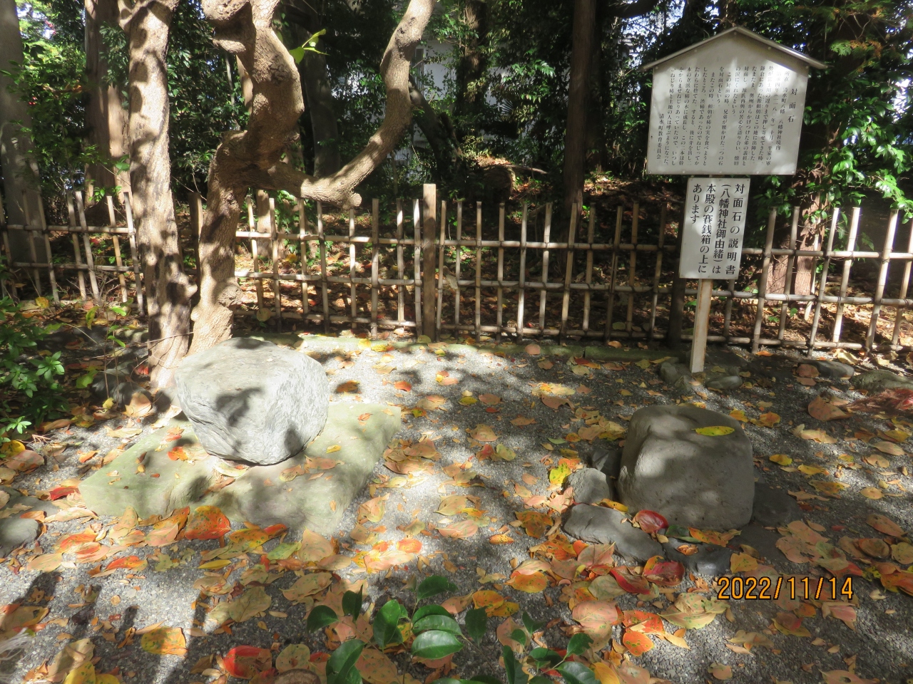 平家討伐の為に挙兵した源頼朝が、富士川の合戦の為に黄瀬川近くのこの八幡神社がある高台に陣を置いた際、挙兵を知った義経が奥州より駆けつけ20年ぶりに涙の再会を果たした場所とされています。 対面石はその対面を記念して置かれました(八幡神社御由緒資料から抜粋)