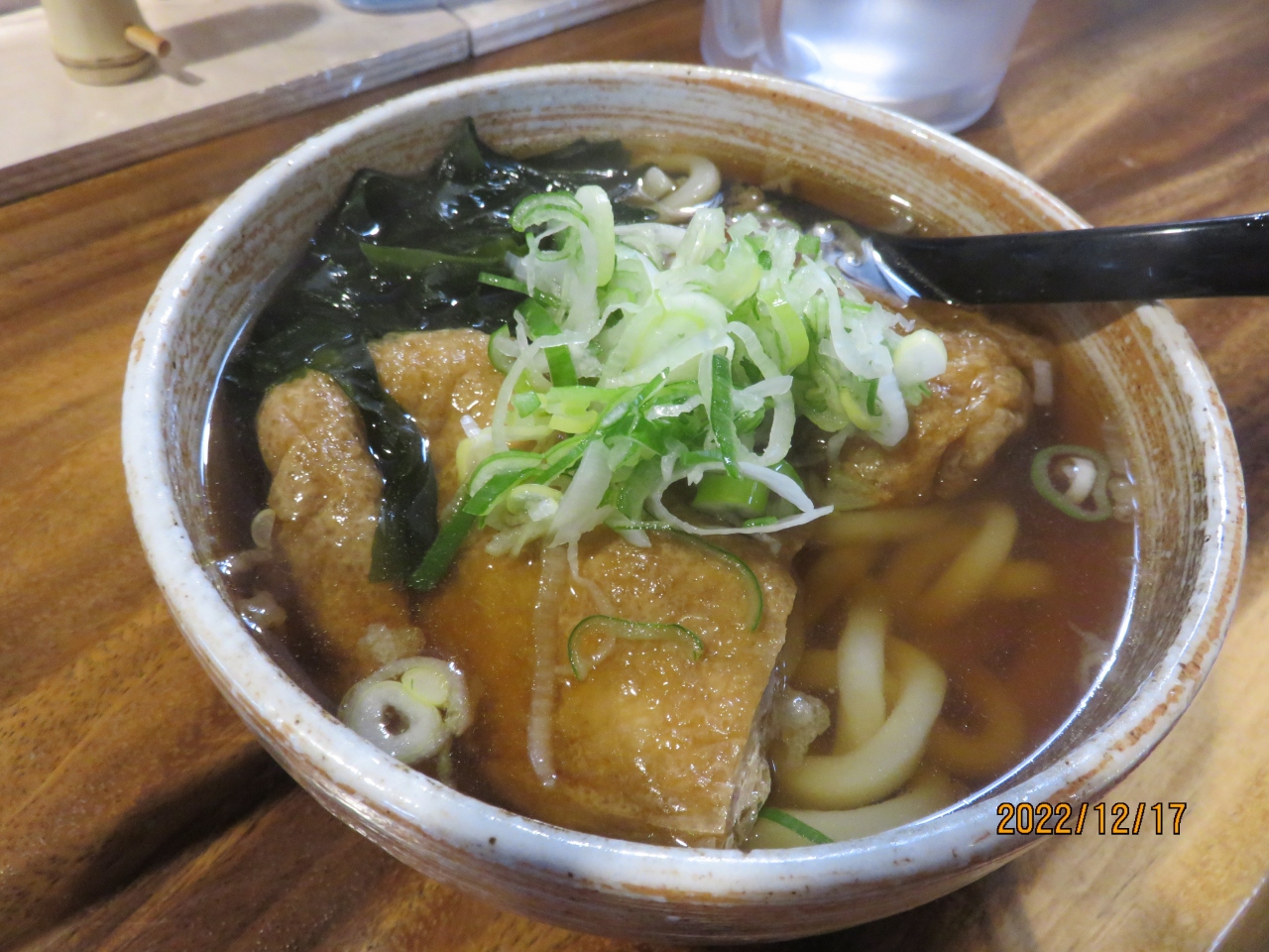 妻がオーダーしたきつねうどんも、大きなお揚げが2枚乗り、だしの利いた美味しいつゆのうどんでした。 他にも温かいうどん、冷たいうどんのメニューが数種類ありました。