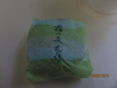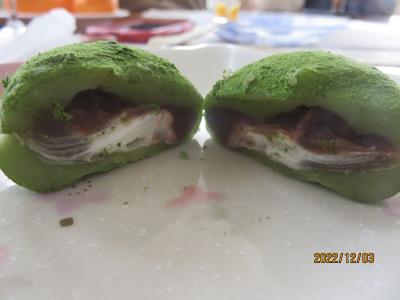 大福は中の餡が、生クリームとこしあんで構成されていて、それを包む餅には新宮産の抹茶が練り込まれ、さらにまわりにも抹茶がまぶされています。 抹茶の風味とほろ苦さ、対して中の餡の甘さがよく合って本当に美味しい大福でした。