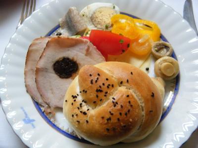 空港へ行く電車で、お昼ごはん。ベーグルのポーランド発祥説になってる オ...