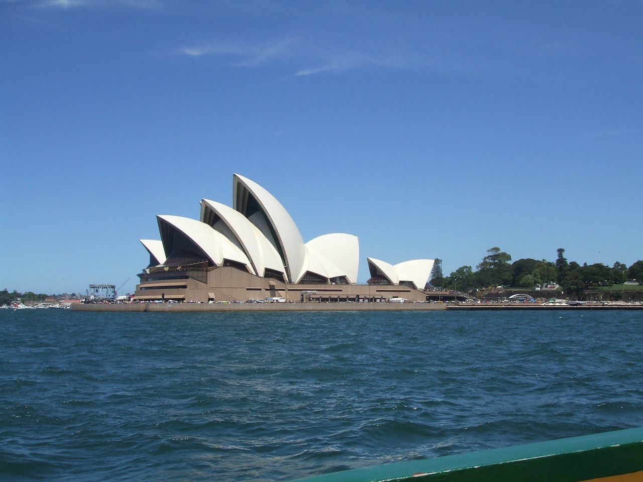 カンブリッジホテルからぶらぶらシドニーの街の中を海に向かって歩いてオペラハウスを見に行った。年末なのに昼間は半袖でも暑い!アイスクリームを食べながら30分位で海岸に着いた。歩いて近くにいくより船でちょっと離れて見たほうが大きさと迫力が感じられると思い湾内の観光船に乗った。本当に真っ白で印象的な建物、印刷物では何回も見ていたが実際に見ると迫力が違いすばらしい!1度は見ておいて損は無いと思う。