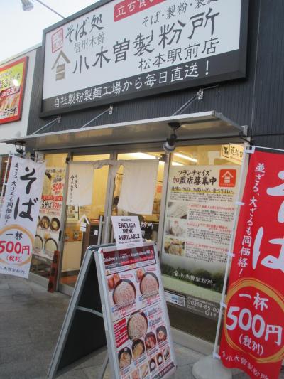 松本駅で、大糸線から特急あずさに乗り換える間に、サクッと信州そばを食べたくて、駅近くのそば屋を探していました。ここは麺を茹で置きしないということで、他の立ち食いそばやとはレベルが違います。これが500円+税で食べられるとは・・・。大盛りも同額だそうです。山賊焼きもおいしかったです。