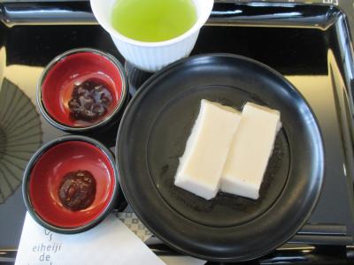 修行寺に付き物といえば、ごま豆腐?この意識は朝ドラ「ほんまもん」の影響かもしれません。肉や魚を食べない精進料理では、ごまは修行僧たちにとって貴重なたんぱく質なのだそうです。團助のごま豆腐は、福井駅近くのスーパーでも並んでいるほどメジャーですが、こちらの本店ならではのメニューとして、生ごま豆腐があります。口に含むと、とろけるような味わいです。是非、ご賞味あれ。