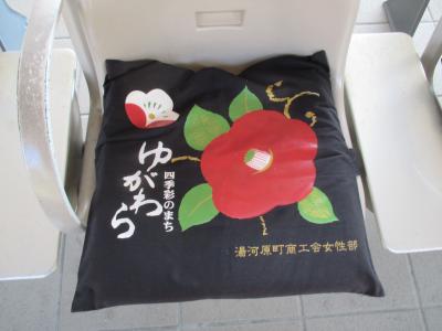 湯河原駅ホームに降り立つと、駅のベンチに、椿の花が描かれた座布団が乗っているではないですか!