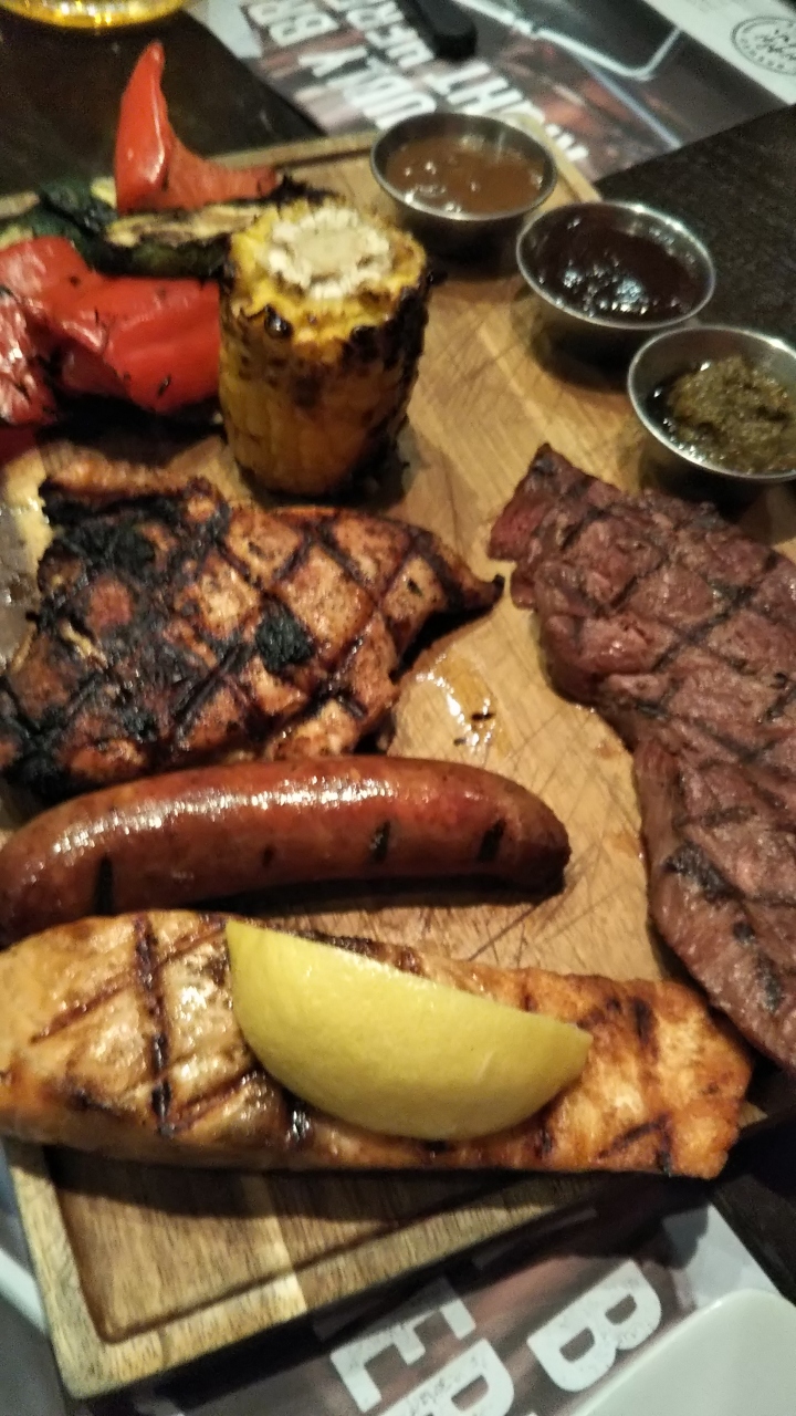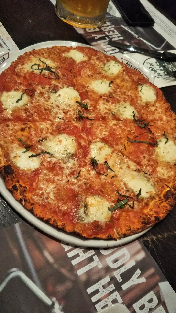 通常メニューのビールは5種類。グラスからピッチャーまで量が選べます。飲み比べセットもありました。食べ物は、ピザや肉のグリルなどを頼みました。