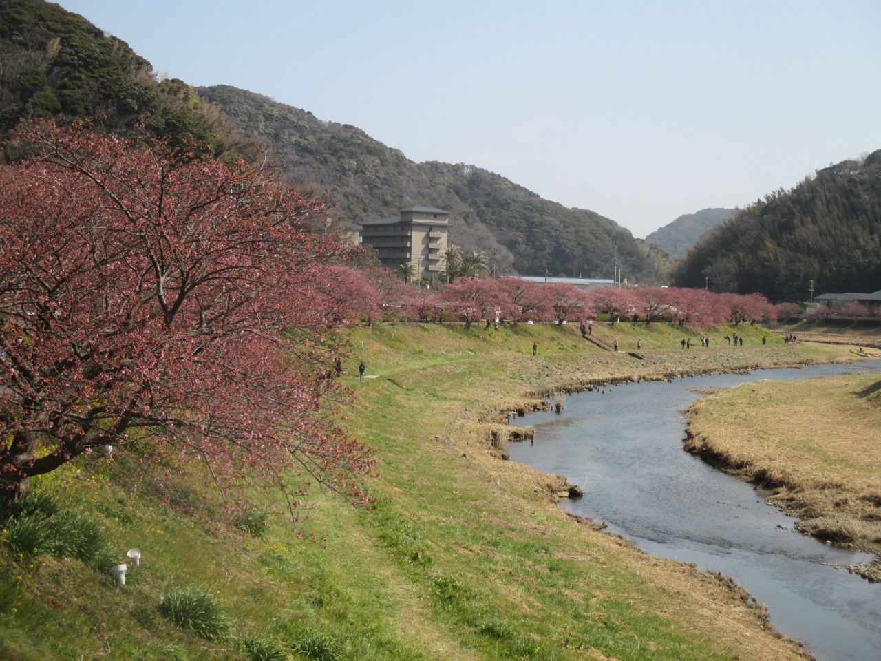 週末に行ったのですが、平日の河津より人出が少なく、ゆっくりできました。青野川沿いの九条橋バス停で降りると、道の駅があります。そこで地元の農産物や惣菜を買出しして、桜を鑑賞してはいかがでしょうか。菜の花畑会場まで少し距離がありますが、散歩を楽しむつもりで歩けば、苦になる距離ではないと思います。