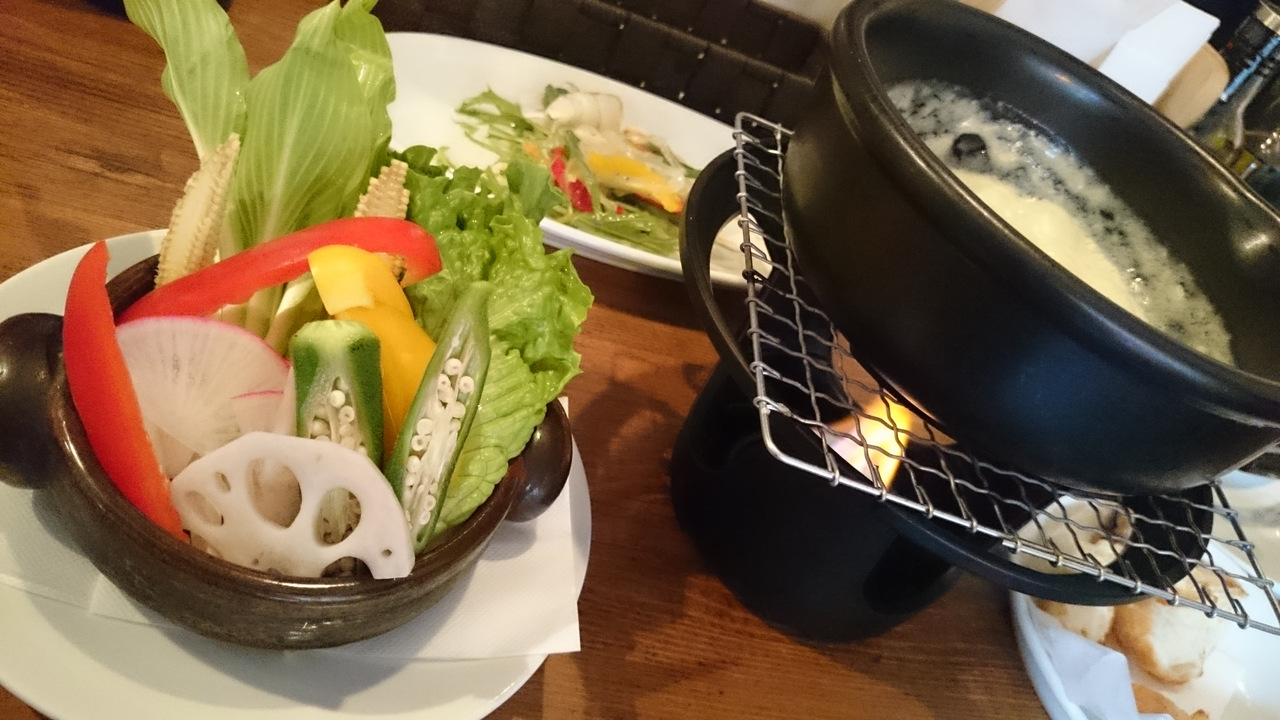 ビール1杯、ボトルワイン1本、前菜1品、チーズフォンデュ(野菜・パン)、ピザで6000円ちょっと。