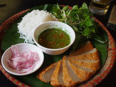 野菜と麺(ブン)をこの汁につけて食べるつけ麺みたいな食べ物・ブンチャー