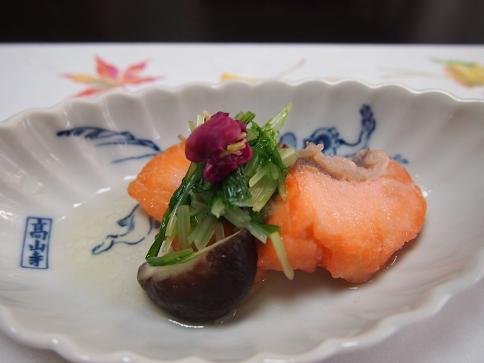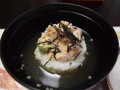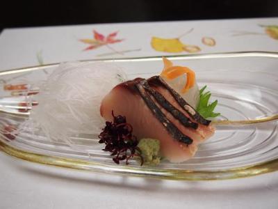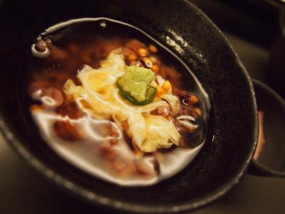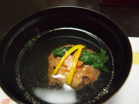 食前酒、先附、椀物、造り、揚物、鉢物 (かぶら蒸し)、御飯 (天然鯛のごま茶漬)水物の6品。
