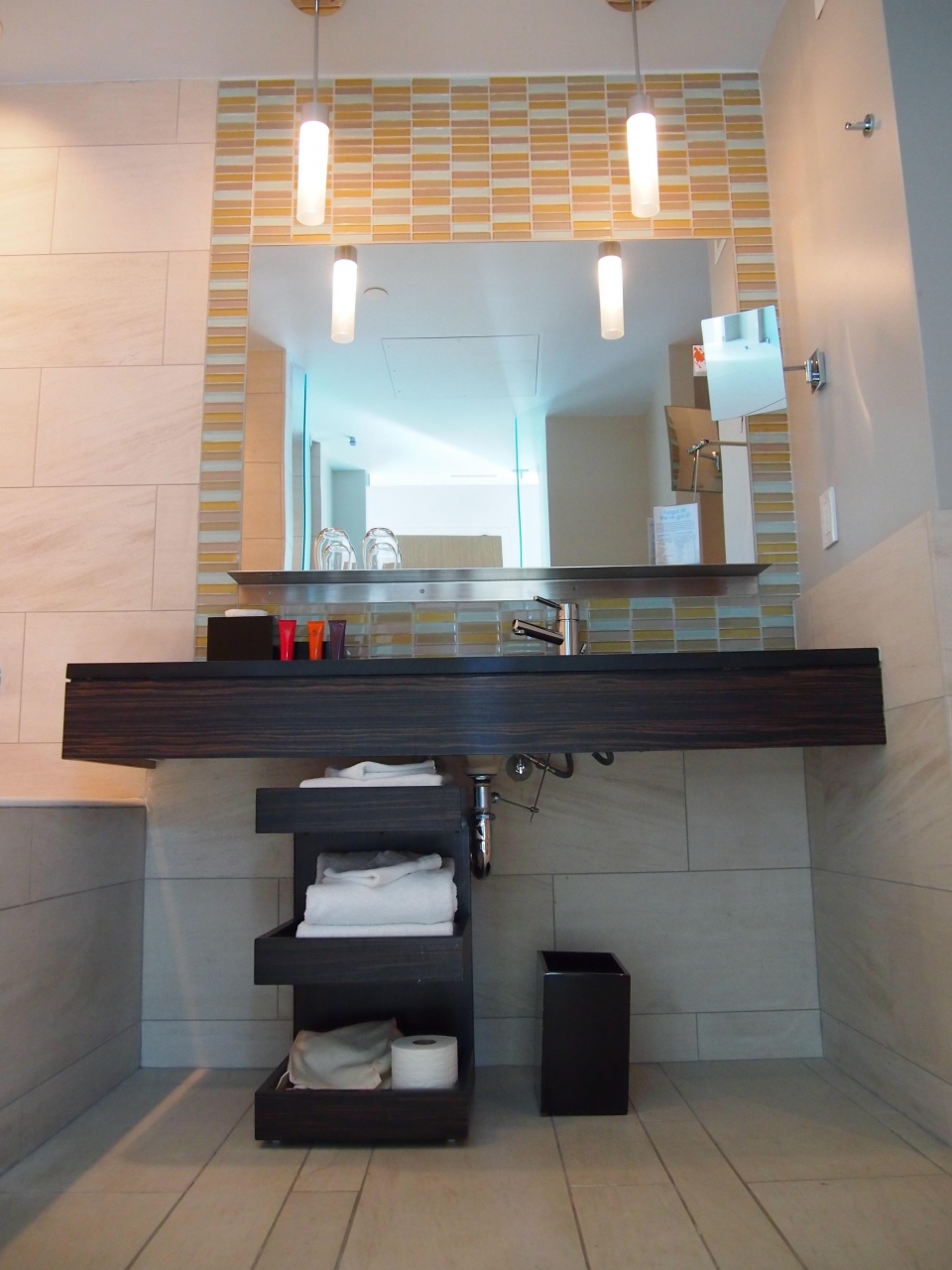 また、バスルームからの眺めは隣のビルしか見えないのでせっかくの素敵なバスルームから景色を望むことができないのが残念です。