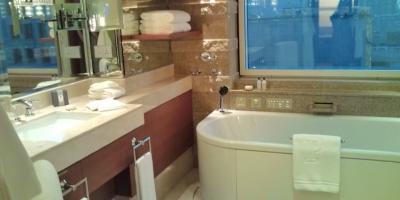 客室はゆったりとしていて大きなバスタブとシャワーブースが別にあり、バスルームがゆったりとしていて使い心地も良かったです。タオルは3セットありました。