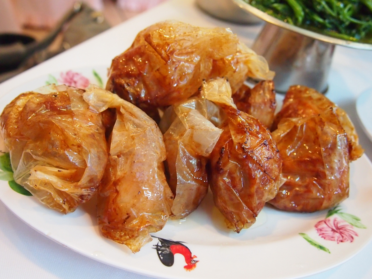 2人で、ハッピー豆腐、青菜のガーリック炒め、ペーパーチキン10個をオーダー
