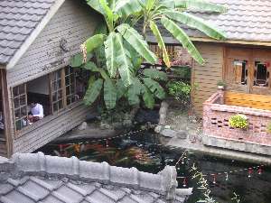 写真を見るとせせこましいみたいだけどホントはもっと広々してます。錦鯉の泳ぐ池の周りを東屋風の建物で取り囲んだレストラン。食事は250元程度。ギョーザや肉まんは×。フロントで鯉の餌(20元)も買えます。