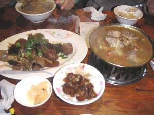 写真は東門ロータリーのお店、麺もスープも寝ぼけていていまいち。後ろに見えるは豚の腎臓生姜炒め300元。- 旅行時期