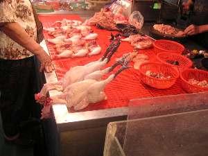 市場では生きた鶏が売られています。気に入ったのを指差して買いましょう。取り出したら羽に艶があるか目が濁ってないか確認してGOを出してください。お店の人が顎の下を剃刀で切って桶に投げ込みます。2分ほどジタバタしますがすぐ静まります。丸ごと70度ほどの熱水に投げ込みます。毛が抜けやすくなるようです、これも2分ほど。次ぎは羽抜きですがお店では洗濯機のような専用機械に頭を下に突っ込みます。バタバタ回転して一分ほどで裸になって出てきます。