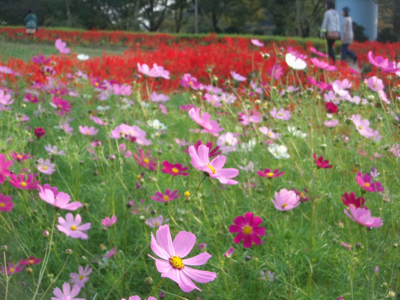 菜の花・チューリップ・サルビア・コスモスなど季節の花が入れ替わり立ち代わり植えられます。車椅子で巡回可能。花の食品館というのがあって2階は食堂で1階に農産物やパンなど売っています。売り切れて早くに閉まってしまうことアリ。夏には親水池に水が流れて小さい子どもがジャブジャブ遊んでいます。