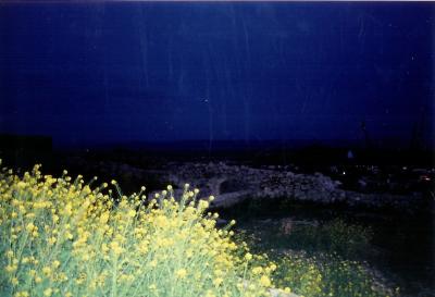 トルヒージョのお城に咲く菜の花のような花々。夜の青さに黄色の花々が映え...