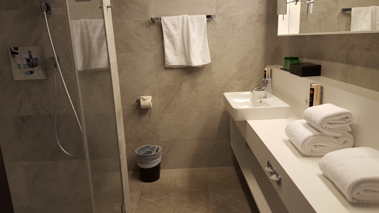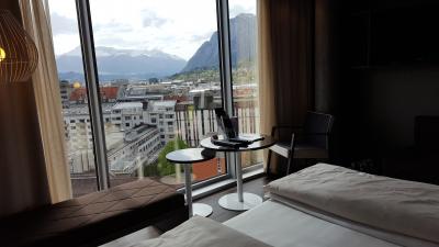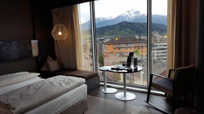 インスブルックは360度山に囲まれているので、どのお部屋からも山が見えます。(が、やはり良い角度があるのでレストランと同じ向きが、一番美しいのだと思います)ガラス張りで景色は最高です。築年数からもっと新しいのか?と想像していましたが(デザインのせいか?)お部屋は暗い印象が……普通の部屋とデラックスダブルの差があまり感じられないので、普通の部屋で良いと思いました。どちらもシャワーのみだったのでチェックインの時にリクエストした方が良い。景色を最優先したい人にはお薦めします。電器ポットとお茶がついています。