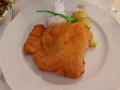 定番のシュニッツェルサラダはたっぷり!見た目少なく見えますが、下にポテ...
